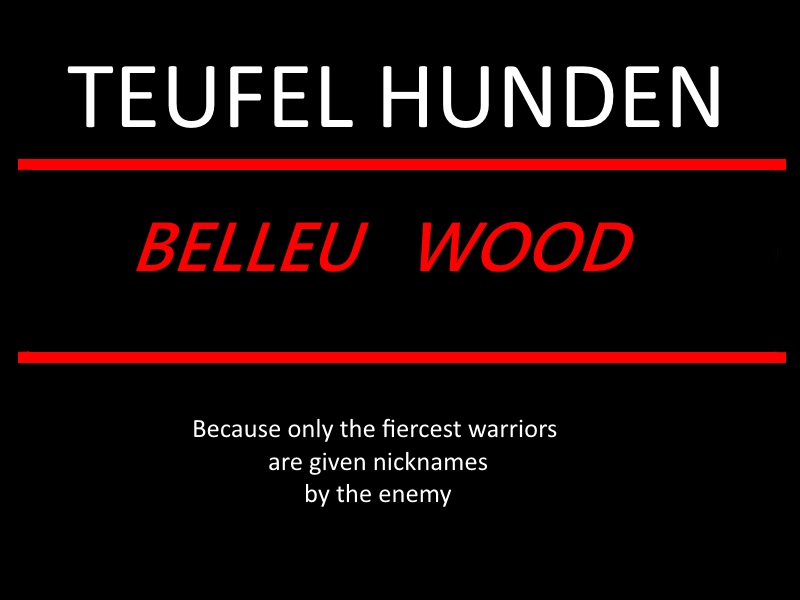 - Additional designs that compliment the theme of the shirt. I would like to see designs that incorporate a grunge brush to the letters, and possibly something that makes the word Belleu Wood a little bit more creepy seeing as how the battle of belleu wood is where many people died and where the term Devil Dog originated from. The font doesn't have to stay the same. I would like for the font to be bold and tough looking, battle tested would be a better word to describe the way I want the font to look.