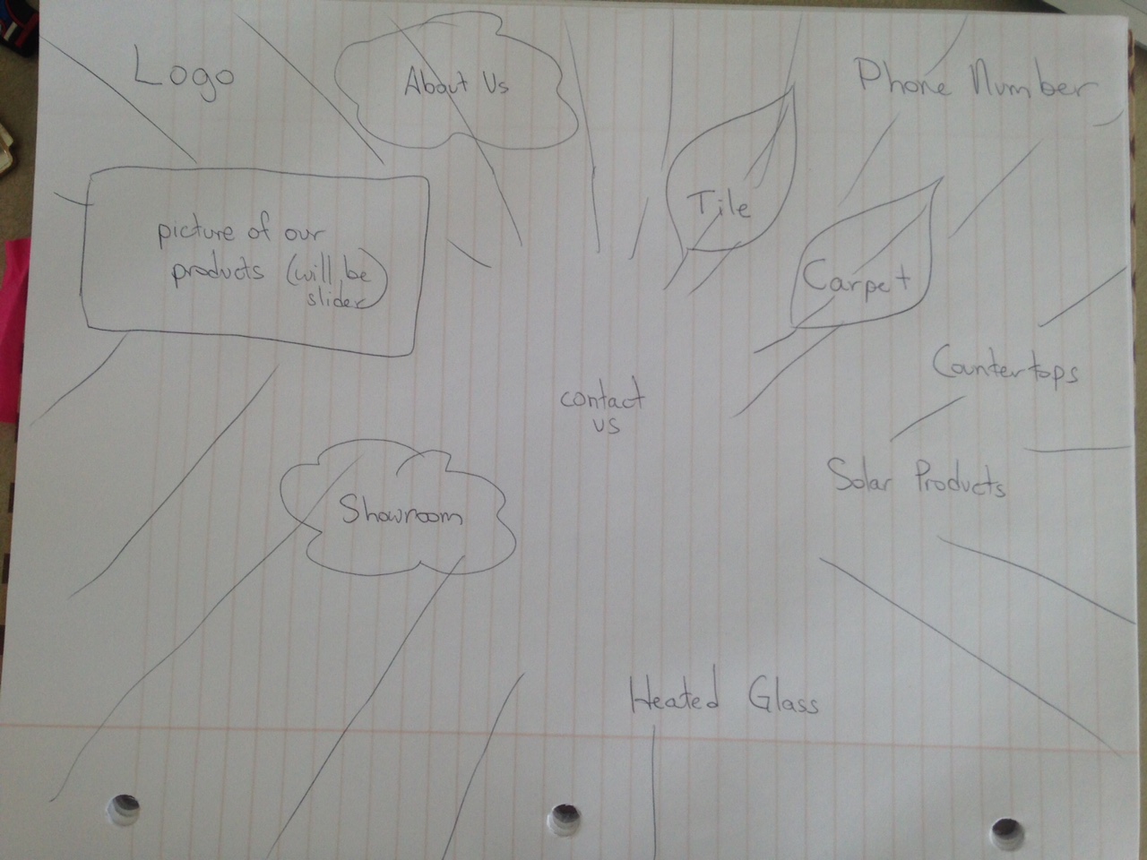- For tabs or links to other pages, rather than having all of the plain boring tabs at the top (which are easy to navigate, but not as pretty) I'd like to experiment with having them throughout the page, perhaps congruent with whatever picture is in the background, as sort of shown in my draft attached. In my draft, I assumed the "tall trees" picture was the background. The lines drawn from the edges of the paper to the center represent the trees. And the links to our products "tile" "carpet" "countertops" sort of follow the circle of the view through the trees and are themselves perhaps on or in a leaf, or within a cloud or some other object representing nature.