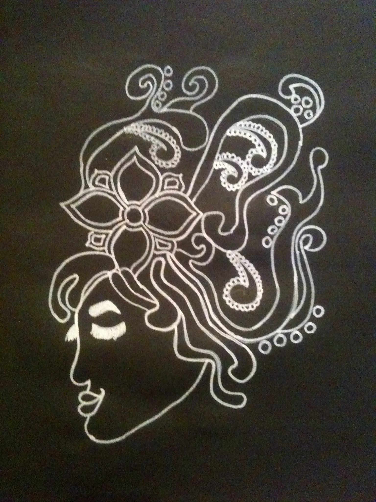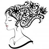 - a silhouette female head with patterns forming an up style with a flower in design.