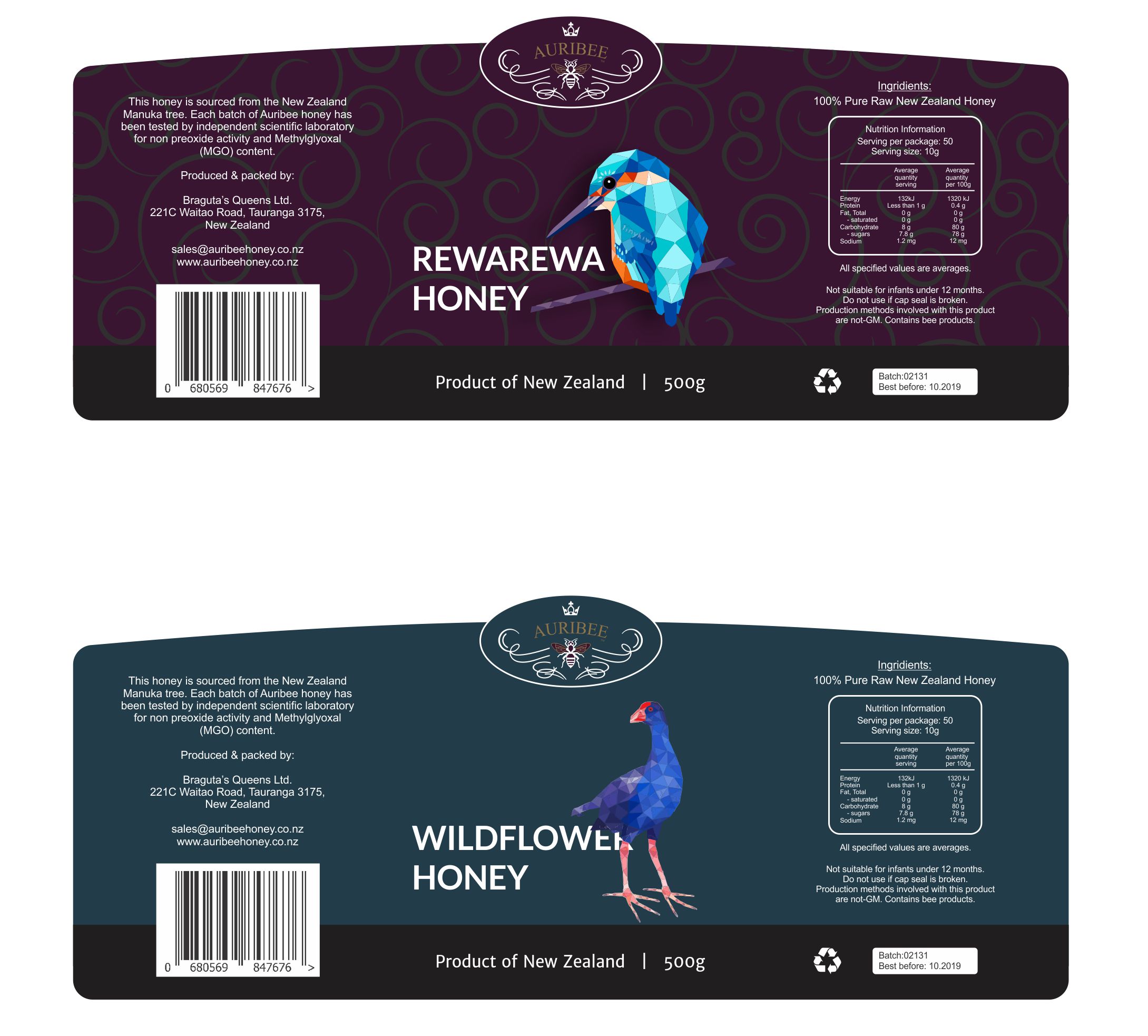 - • Text: “Produced & packed by: Braguta’s Queens Ltd. 221C Waitao Road, Tauranga 3175, New Zealand sales@auribeehoney.co.nz www.auribeehoney.co.nz