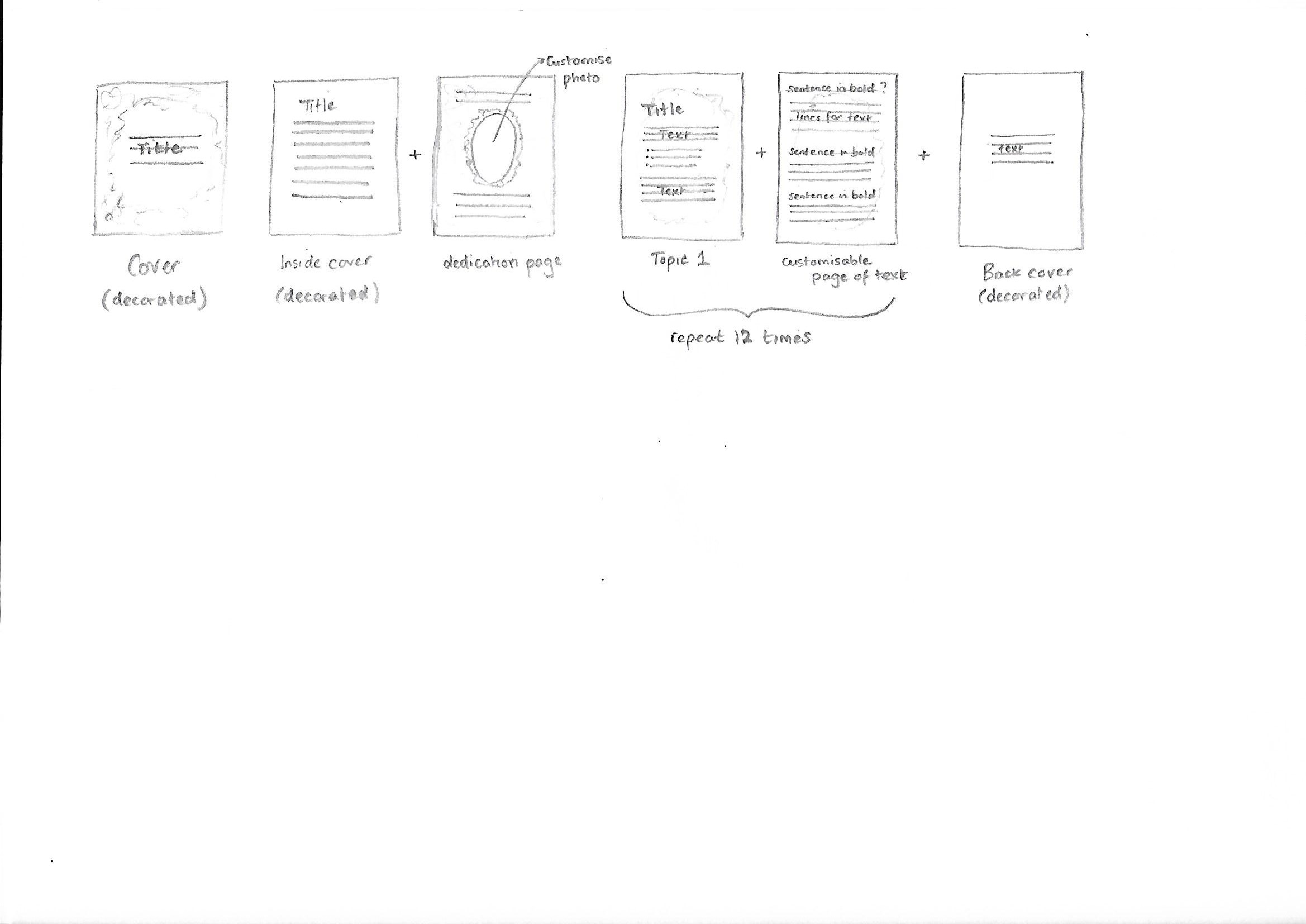 - Please see mock-up of pages attached (page 1 front cover, page 2 is an explanation, page 3 is customisable to add a photo and words of dedication, page 4 and 5 are on one side a title and an explanation and on the other side space to write so please show 3 sections with a title and then plain lines underneath). Ok t show dummy text for the moment.