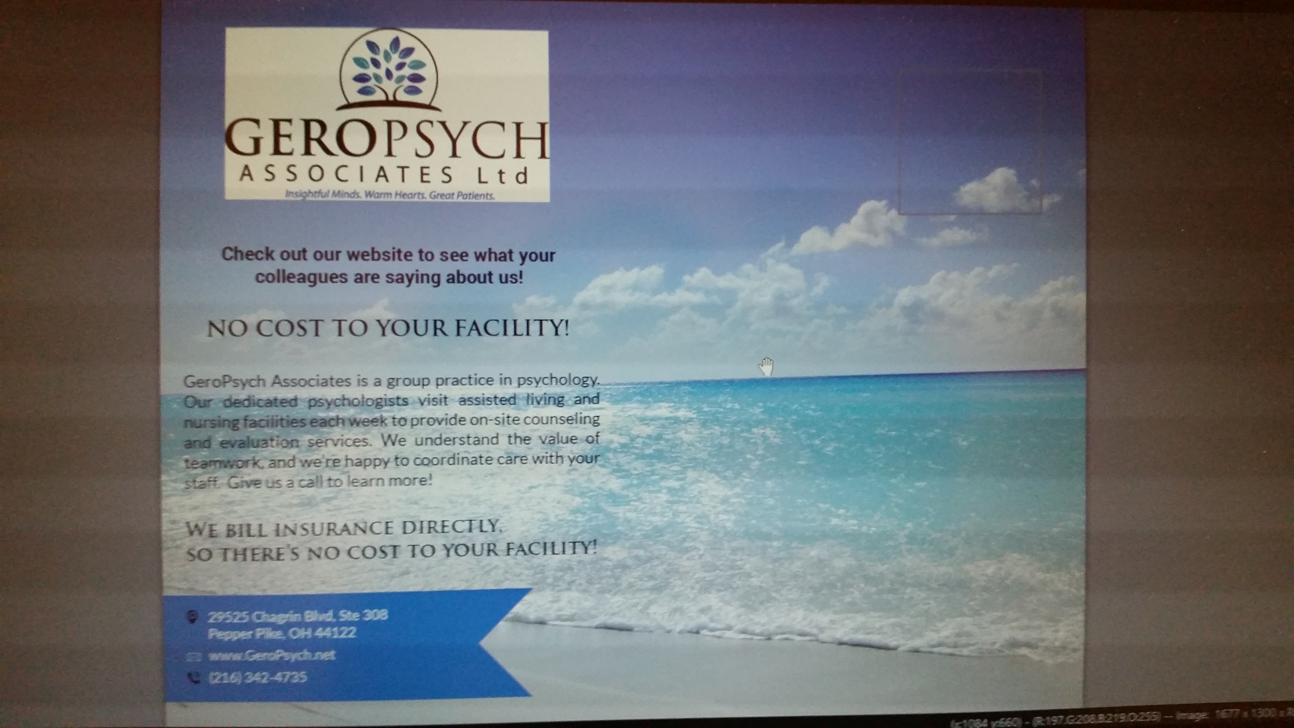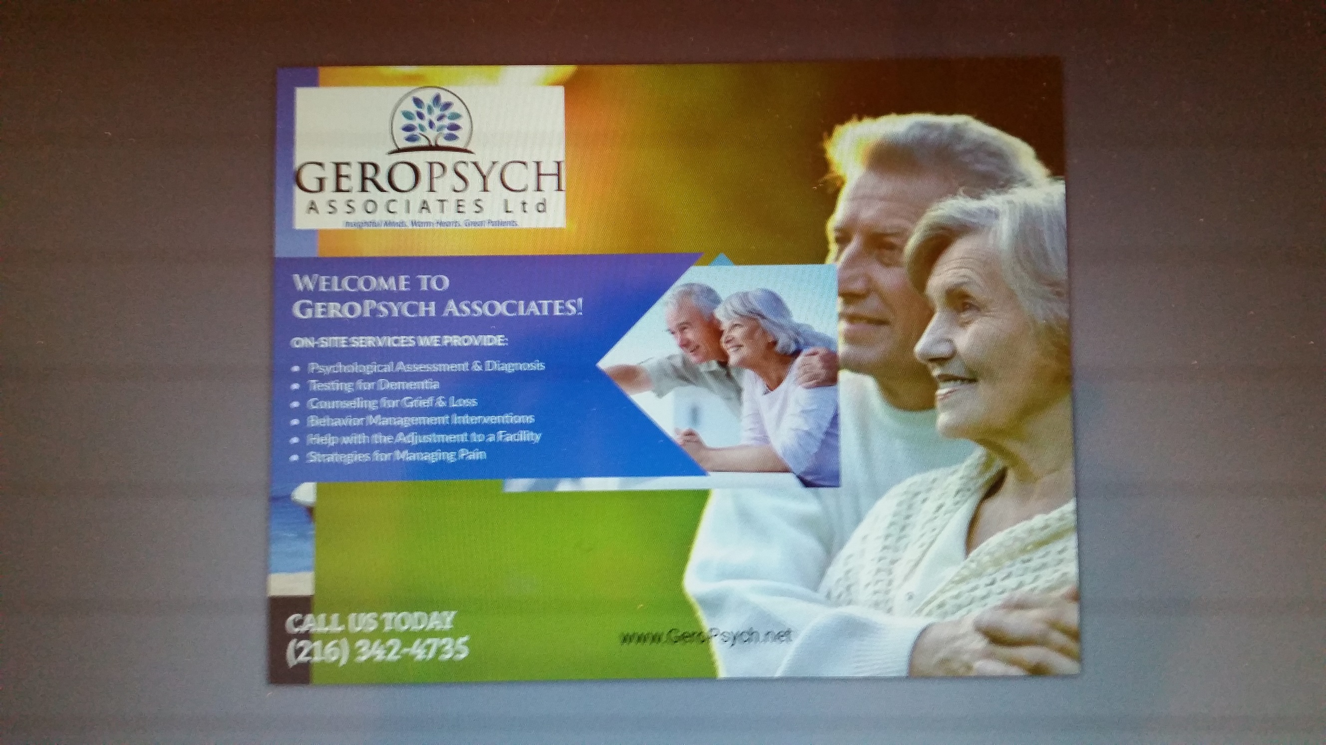 GeroPsych Associates is a practice of geriatric psychologists who provide counseling services in nursing homes. Our marketing is NOT directed toward senior citizens; it's directed toward nursing home administrators who have the authority to invite us into their facilities. We plan to mail postcards to about 100 administrators each month, meaning that we'll need 12 unique designs each year. The goal of this marketing strategy is to improve our name recognition in the professional community. Logo design is complete.