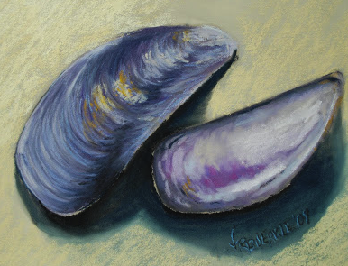 The colors can be purple or blue to reflect the ocean and colors of actual mussel shells.