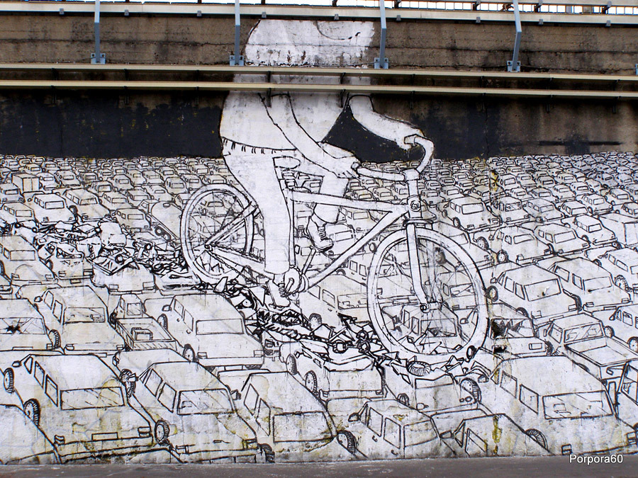 We need to produce a t-shirt for the italian market aiming to show the need of different mobility patterns. We need you to represent in a symbolic way the sentence: “If you plan for cars and traffic, you get cars and traffic. If you plan for people and places, you get people and places.”. The target of customers are (mainly) urban cyclists, therefore we need the presence of a bicycle or of the idea of cycling into it.