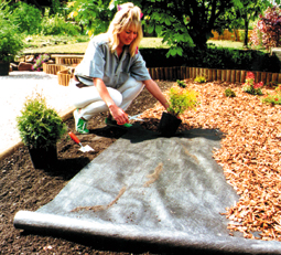 - Unroll fabric and position around existing plants, be sure to overlap the fabric one foot and secure with landscape pins.