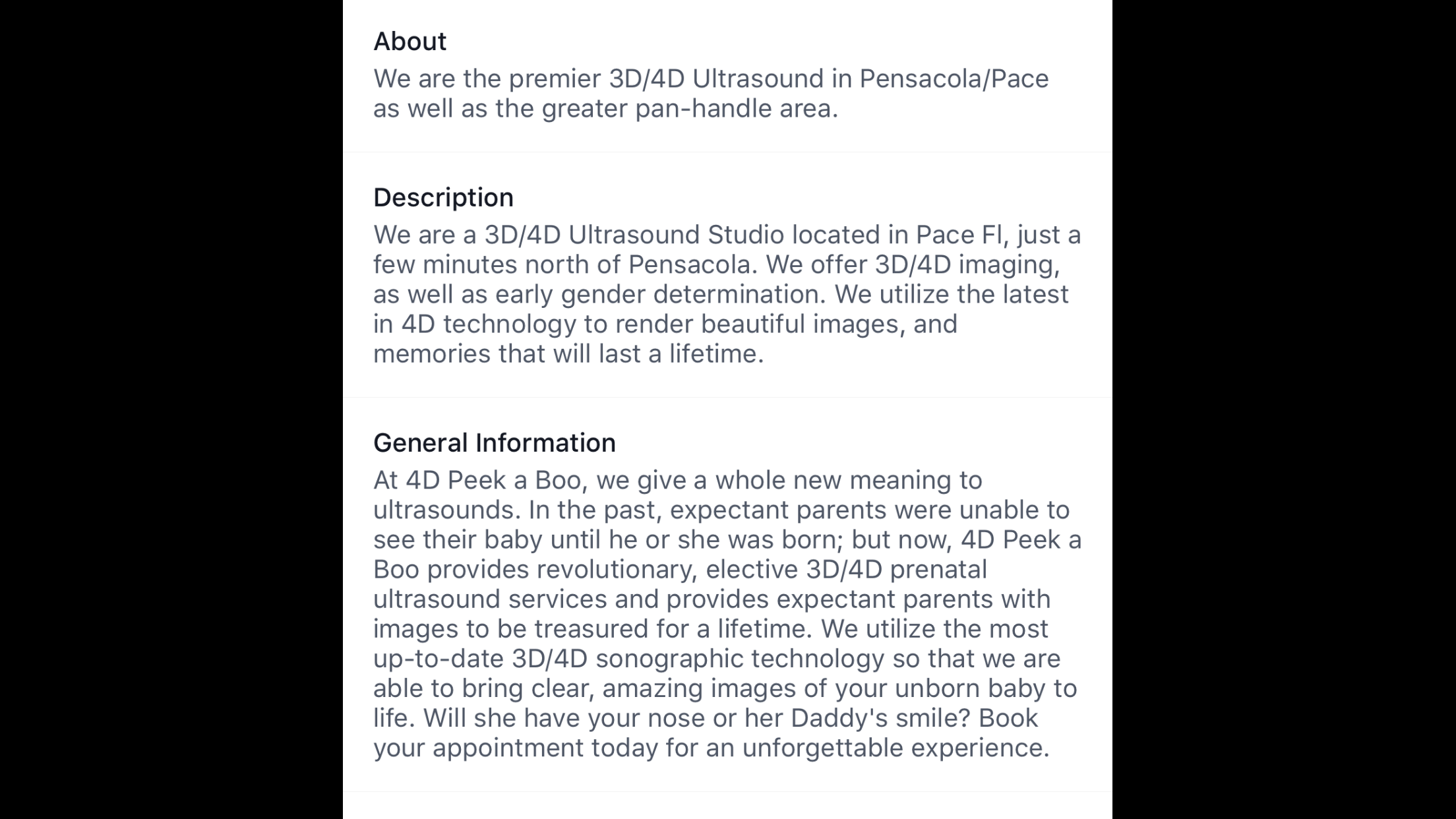 Name of company:4D Peek a Boo Service provided : We do gender determination and 3D/4D ultrasounds Location: 4459 Highway 90 Pace Fl Phone :8503662088we also have the heartbeat bears for sale . I would like for all this info on the rack card and we are trying to reach pregnant women to use us to see there babies before they are born.