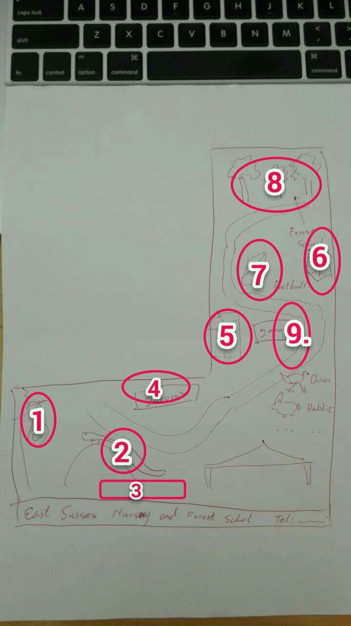- The picture of the nursery layout drawn by a child as basis for the horizontal part of the design plus a vertical nursery tour map (like a zoo map from children's perspective) from that map, parents can know all the major unique selling points - 2000 square meters of onsite forest school, 1000 square meters of garden and playground, animals, various extra curriculum (forest school lessons, French lessons, Football lessons, rugby lessons, cooking lessons, yoga lessons etc.).