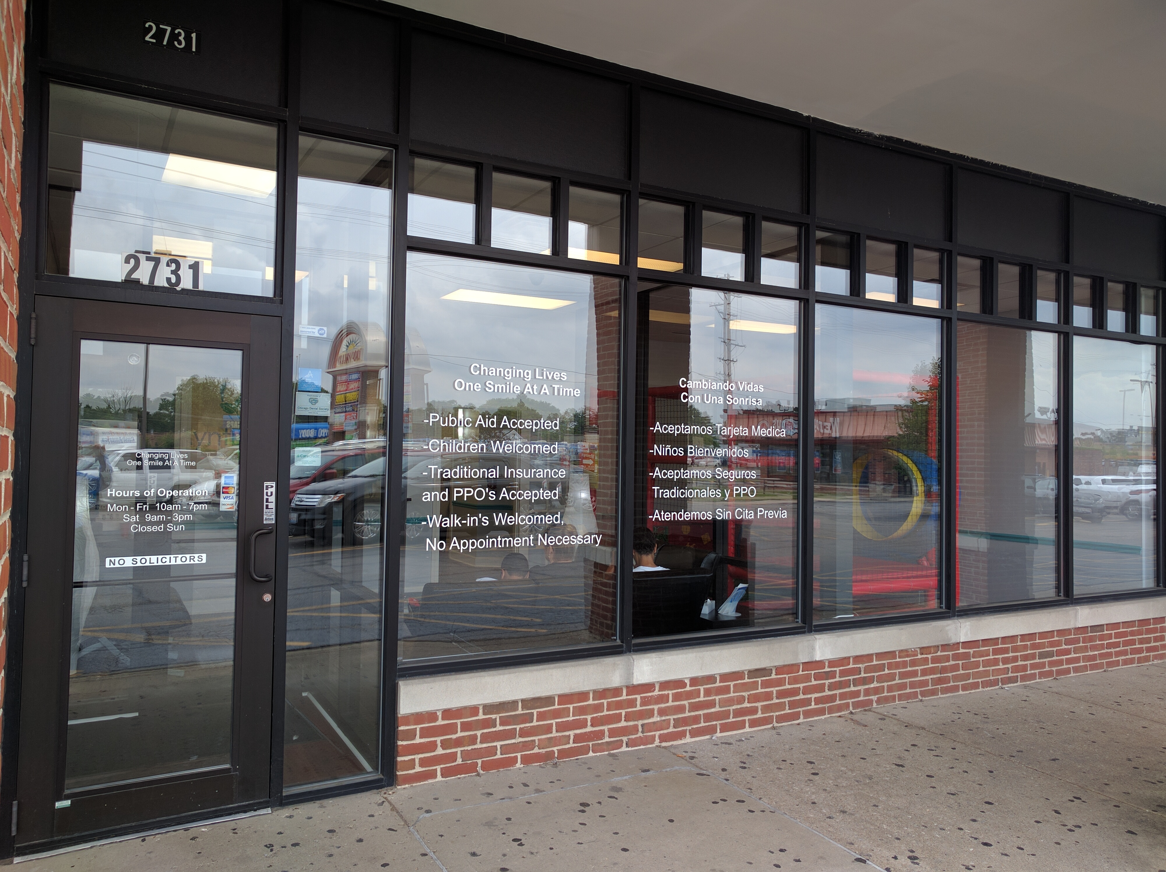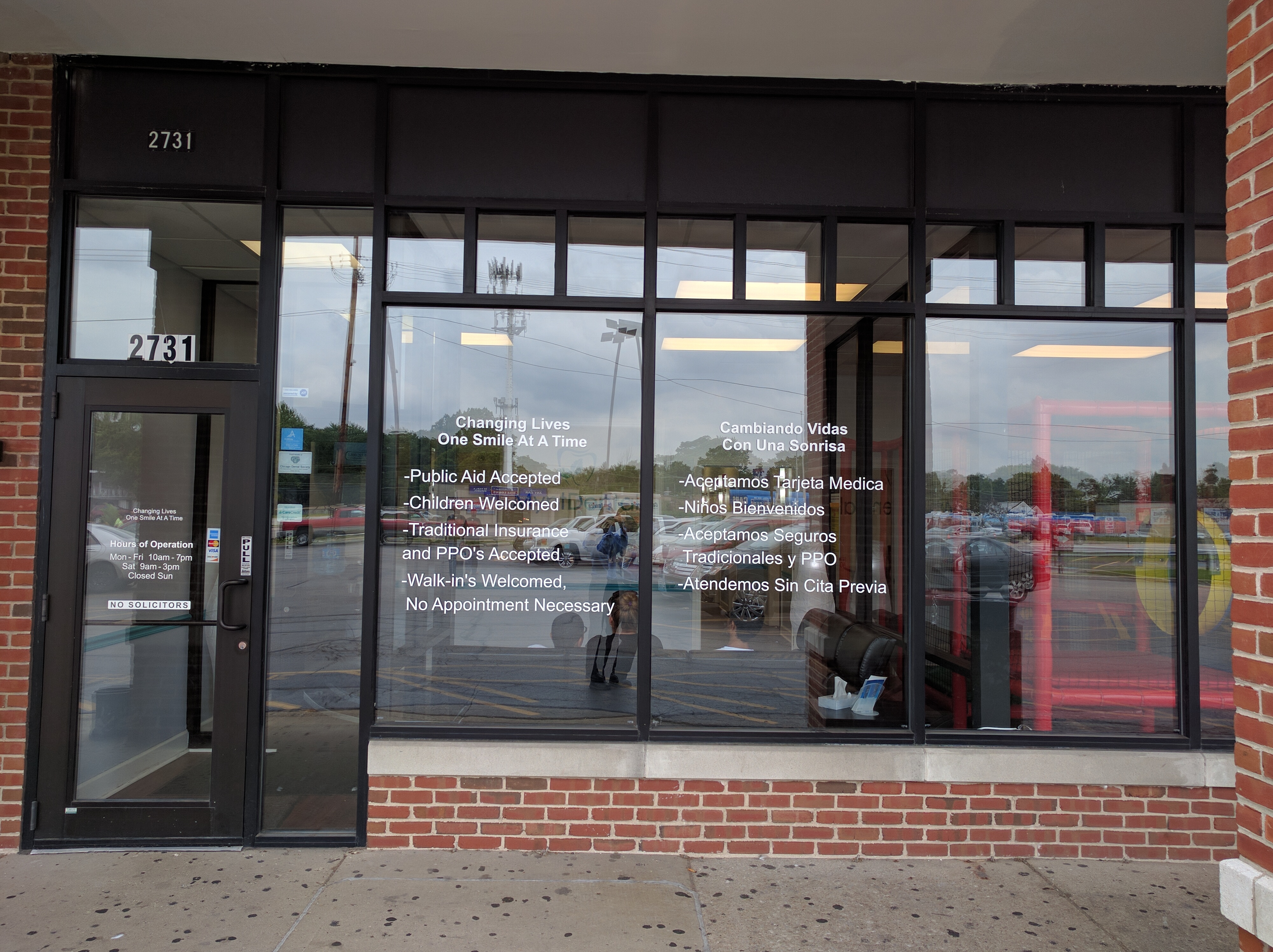 I would like to make a design for a signage for the front windows of a dental office. This Signage will be made with the kind of material that you can't see inside the office, but you can see outside from inside.