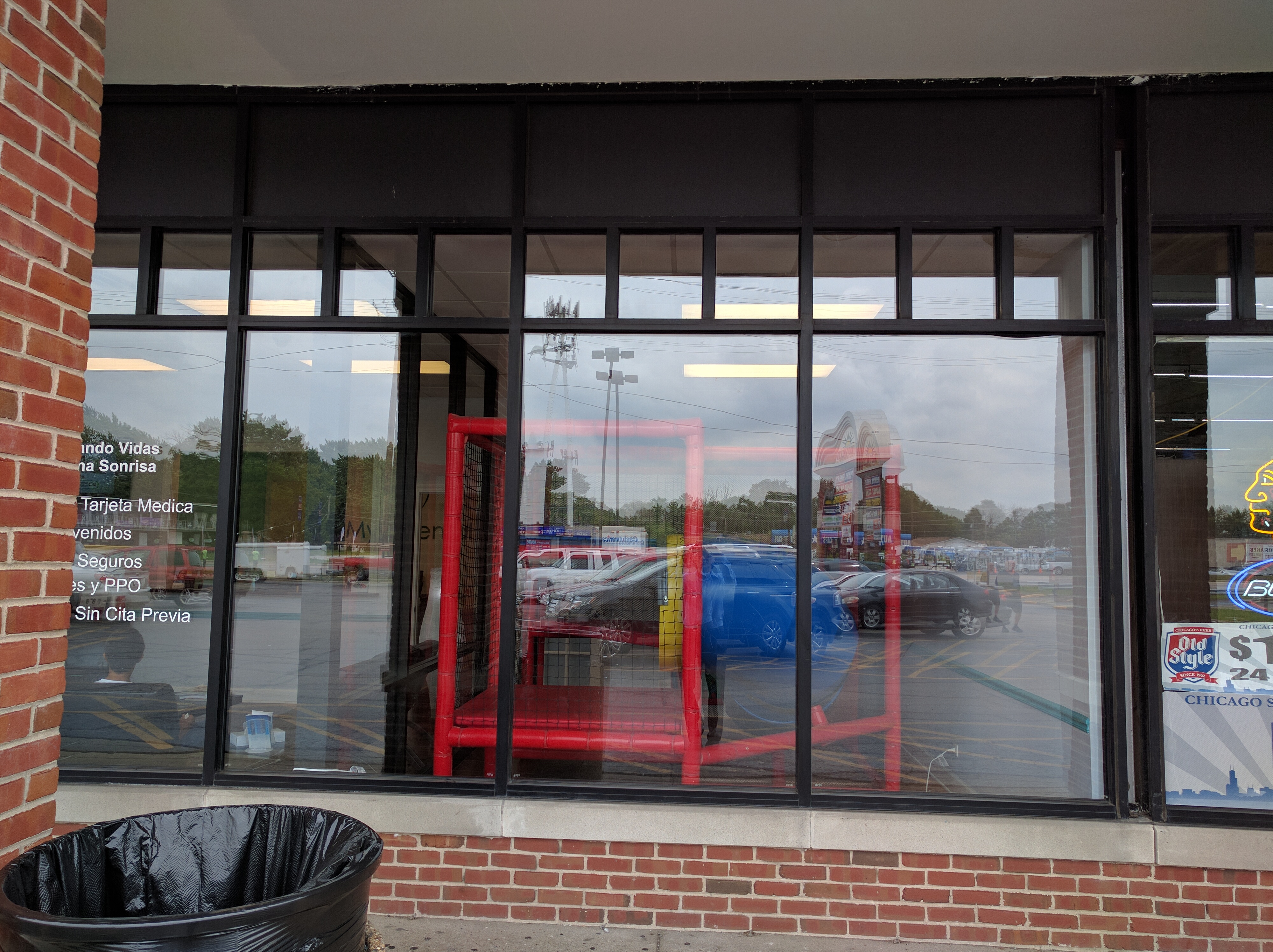 I would like a combination of picture, text ( both Spanish and English ) , the office logo and also phone number. The window is divided into 5 sections as you can see in one of the images. It starts right after the door and ends with the play ground area.