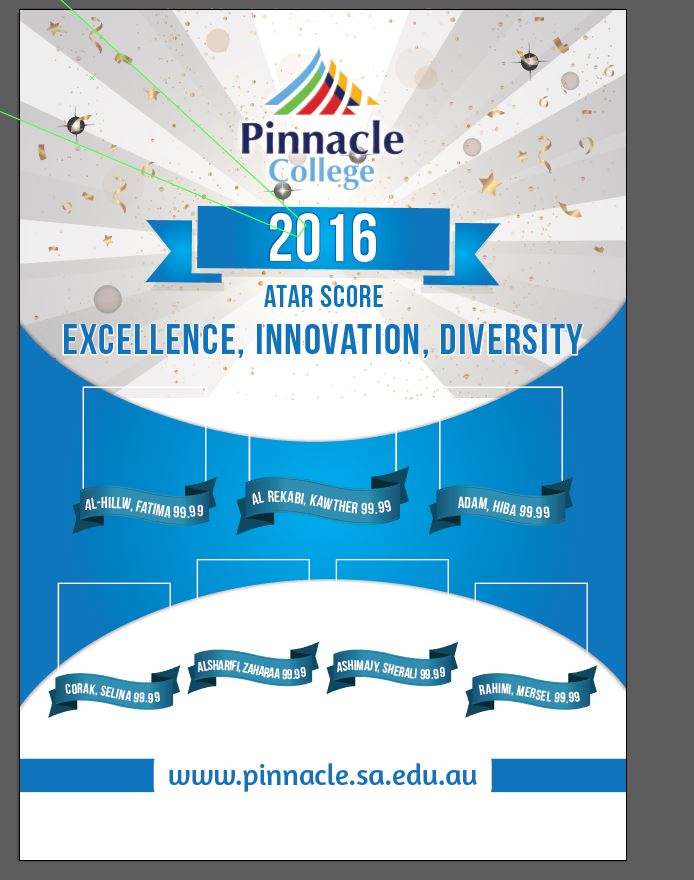 - Nice design that's eye catching and stands out. As it's only our third year and we are expecting few students to achieve high ATAR Scores, the design needs to be eye catching and kind of celebrating the success.