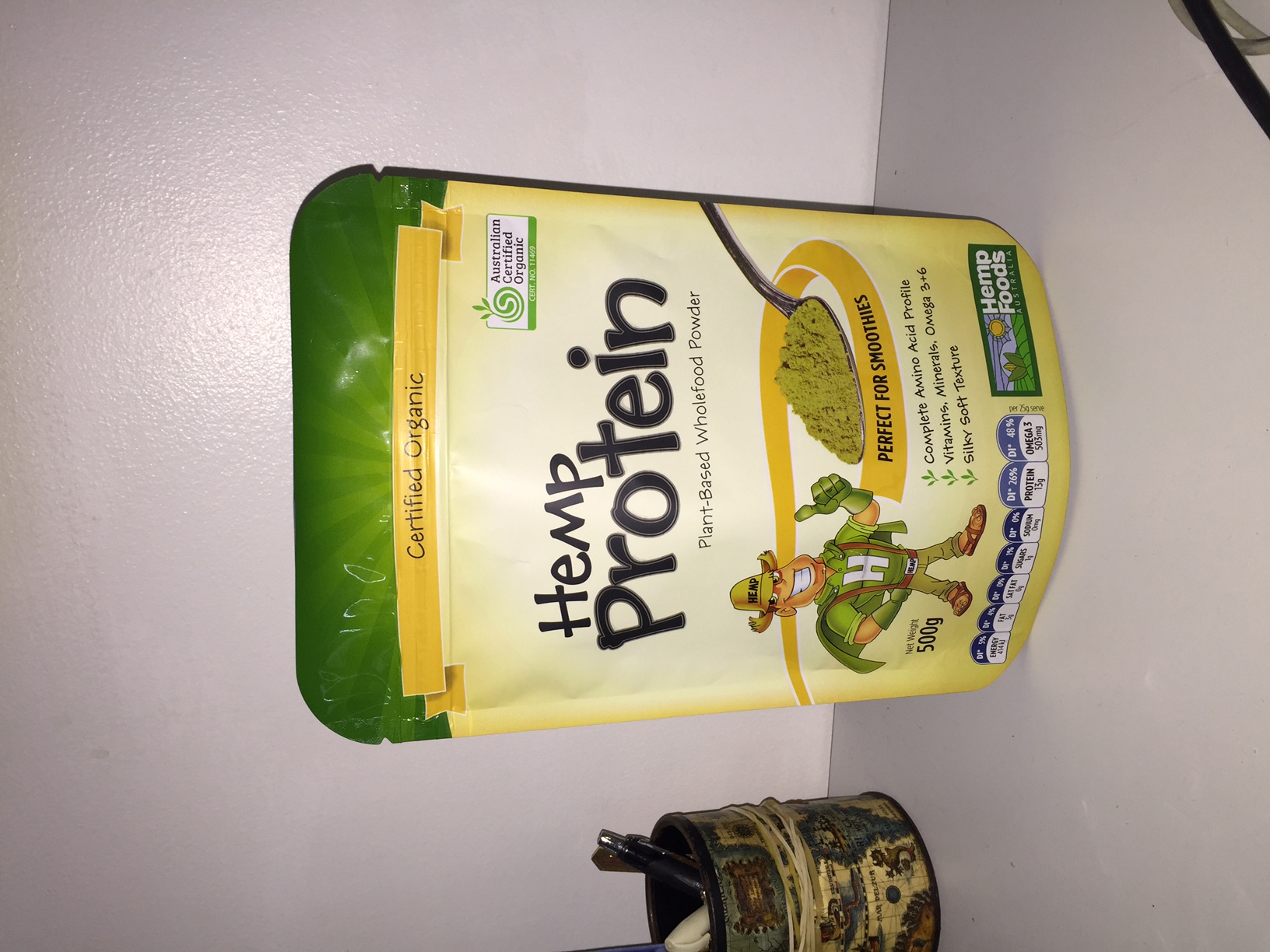 see attached photo of competitors hemp protein pouch as example of pouch design