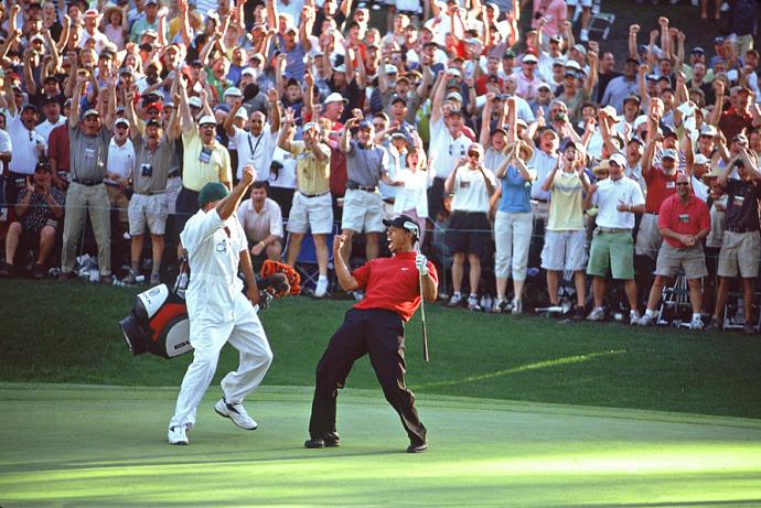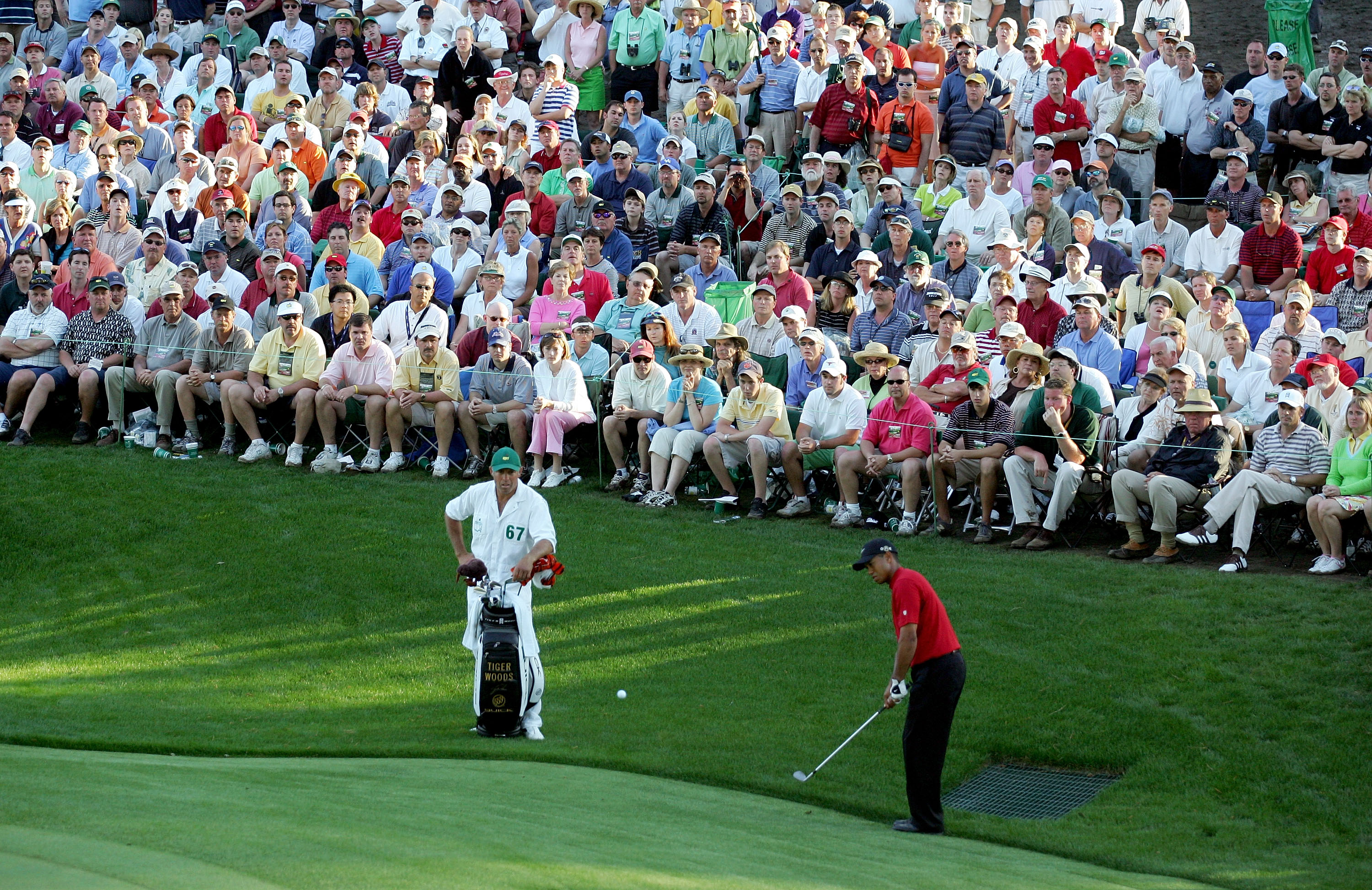 The tournament will forever be remembered for Tiger’s sensational chip on the 16th. Aiming 20 feet (6m) to the left of the hole and using the sloping green to run the ball towards the hole, the ball crept towards the cup and appeared to stop on the lip of the hole before toppling in for a dramatic birdie.