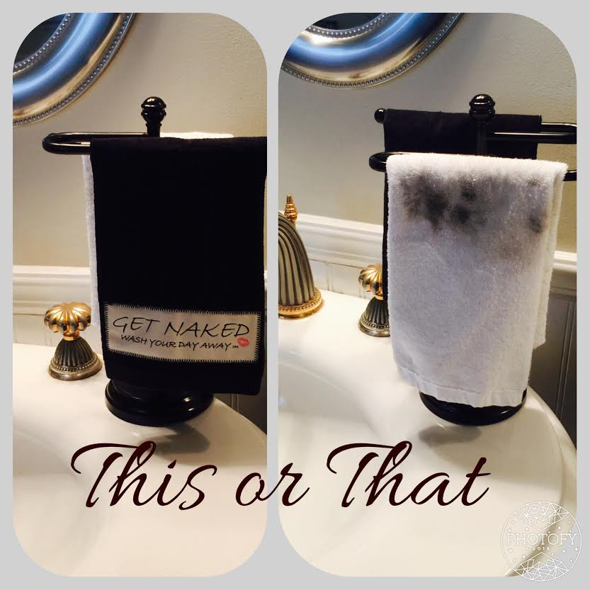 - Black cream girly , also state in big writing that it's a " no show makeup towel" with a tiny light pink lip between the show and makeup. Include www.littleblacktowel.com Less is Mooers, LLC