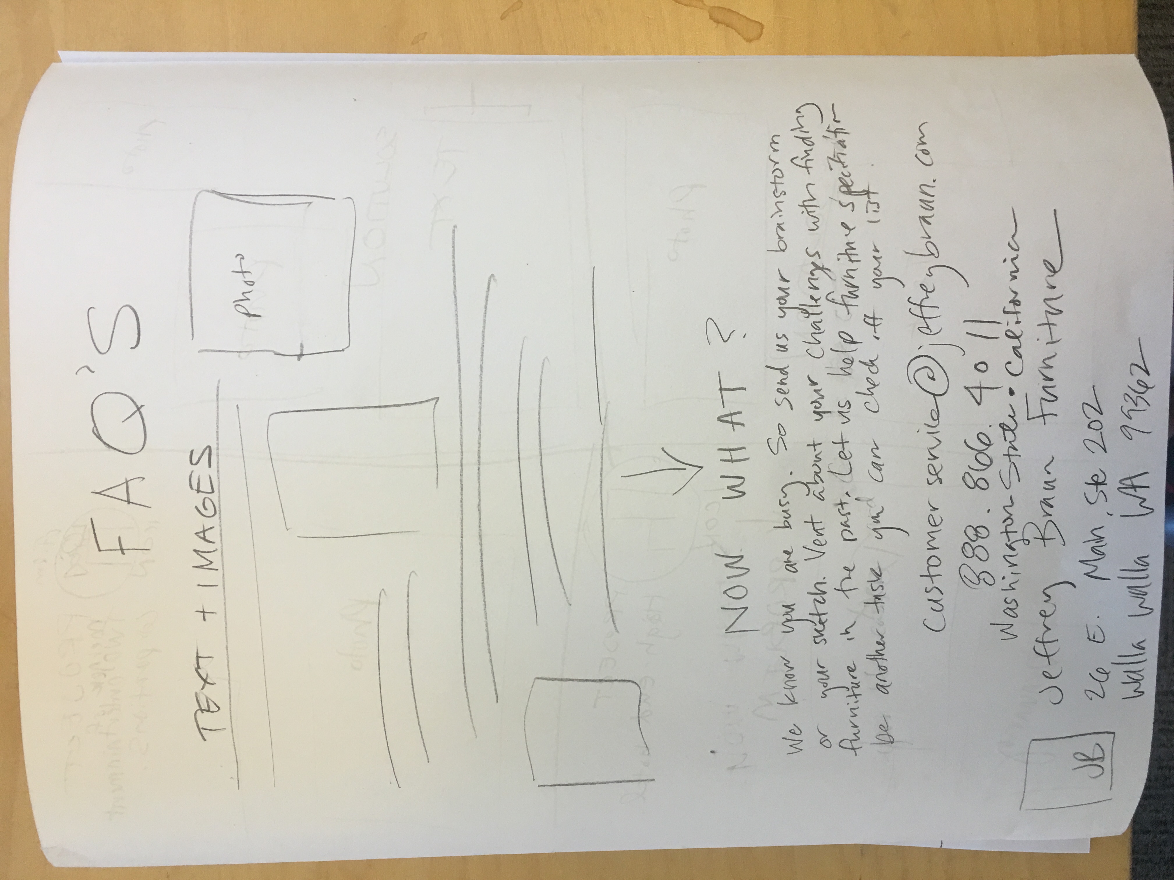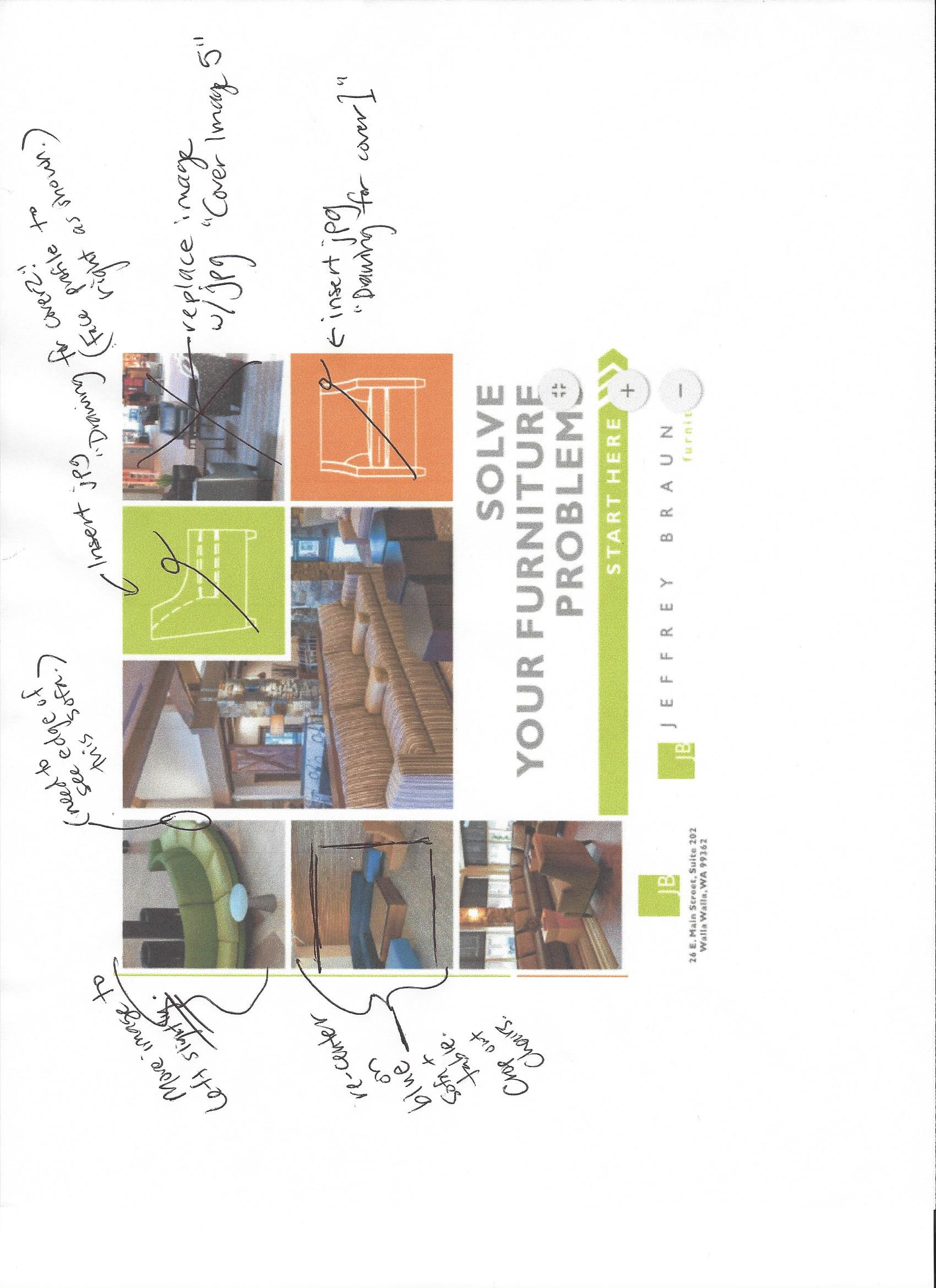 - No old fashioned/cursive fonts. No shadows behind photos or shadows behind text boxes. Since furniture design is our business, do not cut off the lines of our furniture designs by overlapping text or images.
