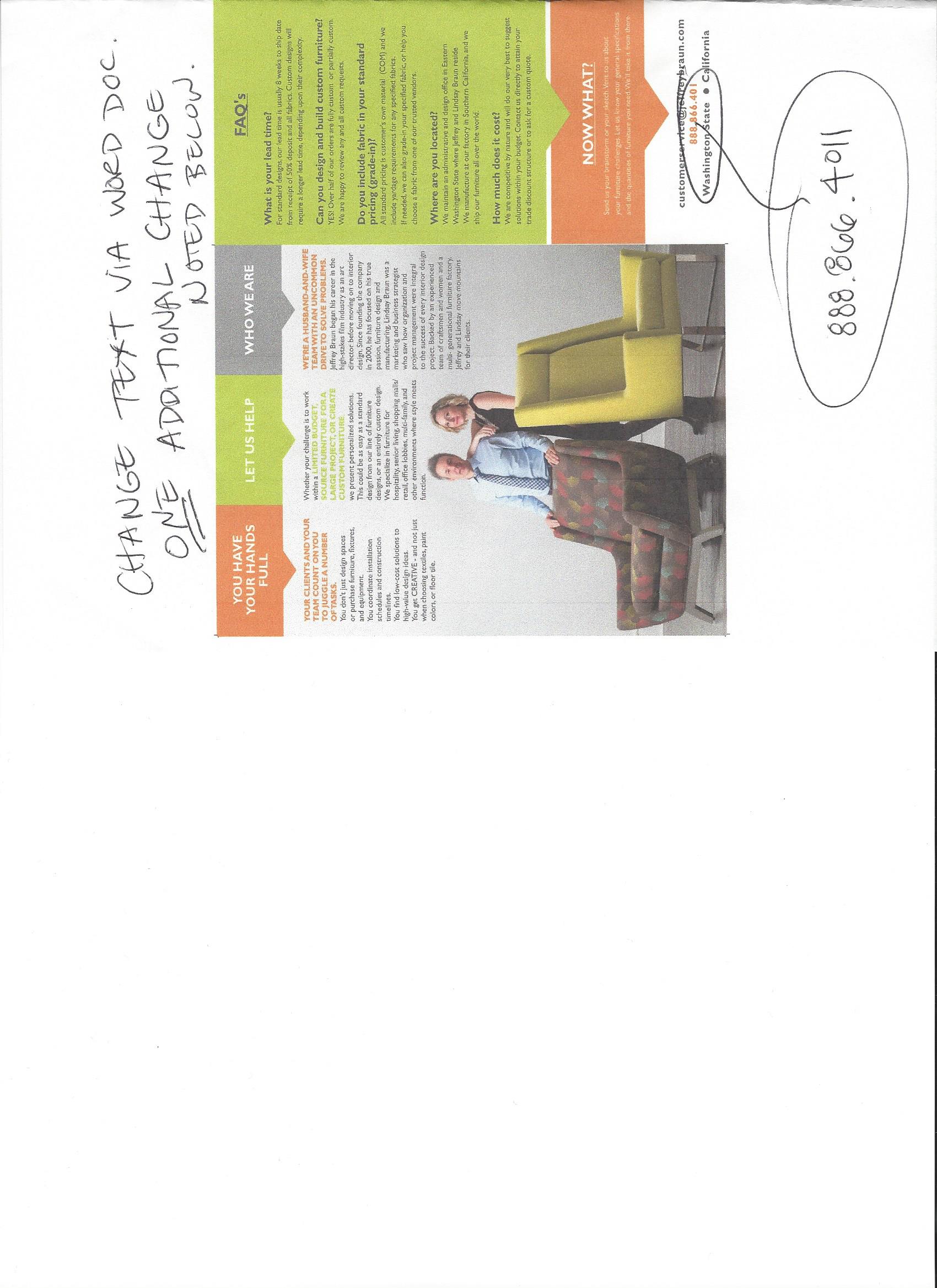 Please note CHANGE IN SIZE: 11 x 25.5 overall size, tri-fold brochure. Use lots of photos and must have a high-end, clean look because we are in the interior design industry. Designer must review our website to get an idea of branding! (www.jeffreybraun.com).