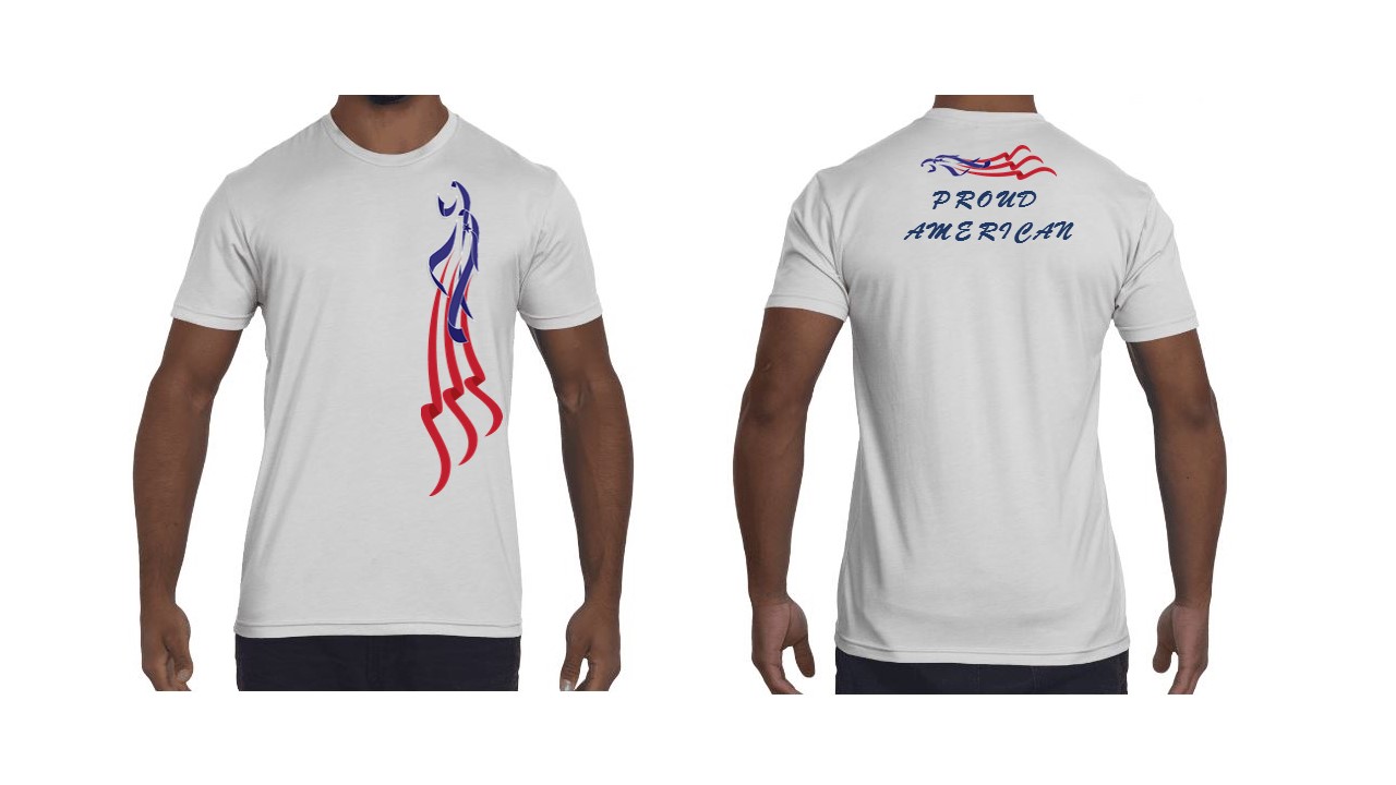 - I would like for the words "Proud American" to be designed in a way that they can stand on their own in the front of the shirt with a small logo of the flag or eagle over the heart or left side breast.