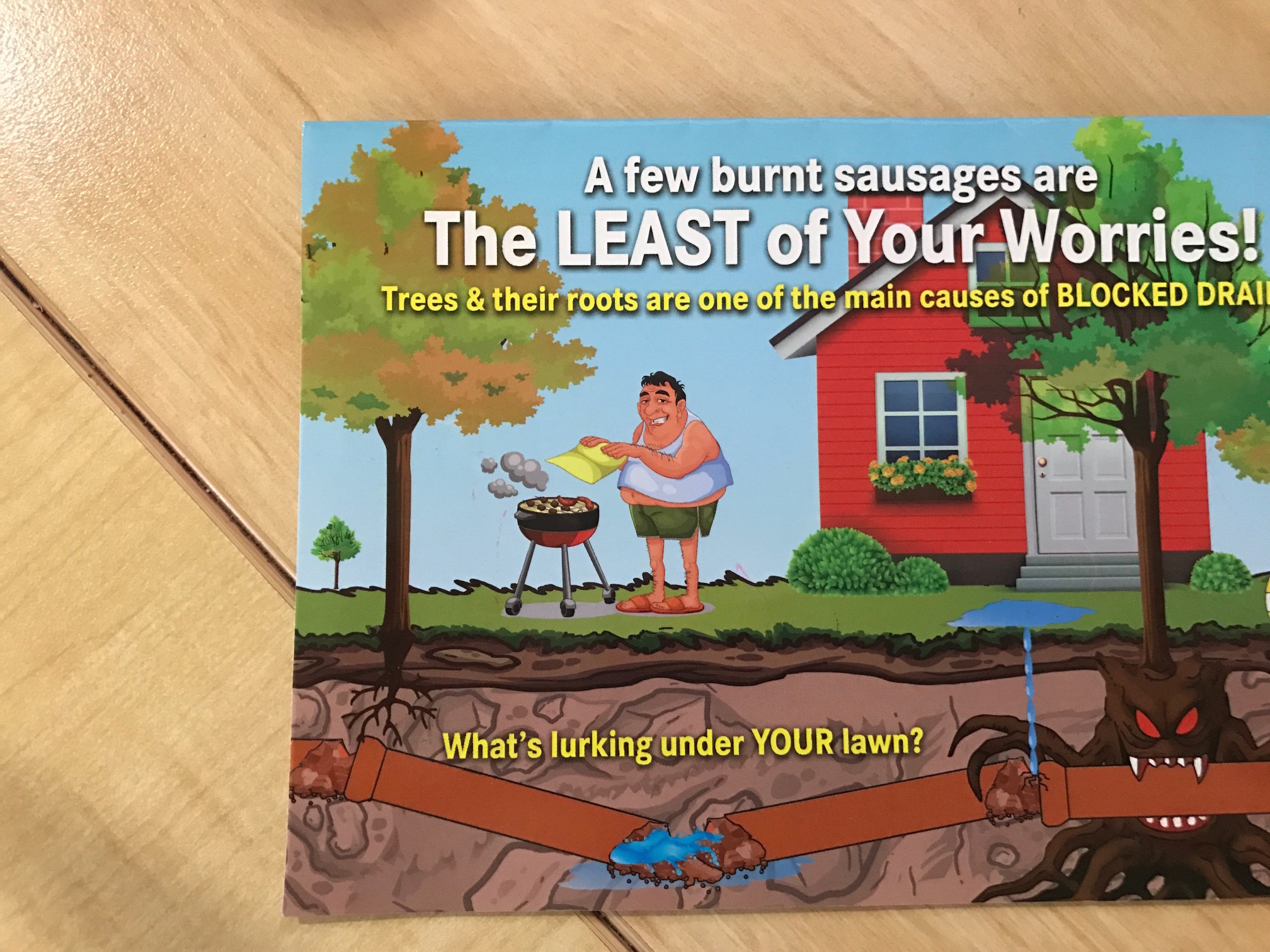The tree roots dont need to have faces just to emphasise that the can destroy your pipework, so please include a section of broken pipework with water/debris coming out of it - refer to the attached pic so you know what i mean.