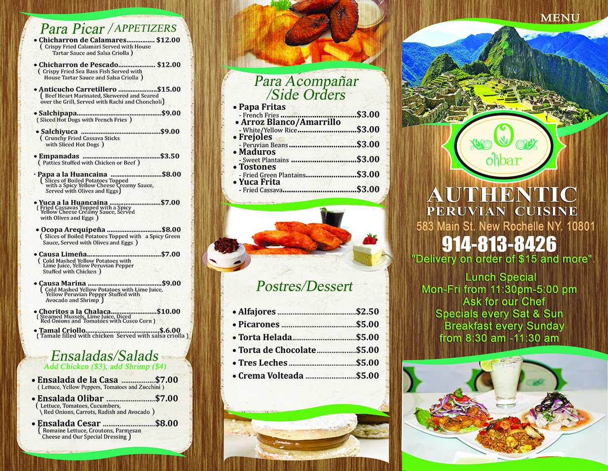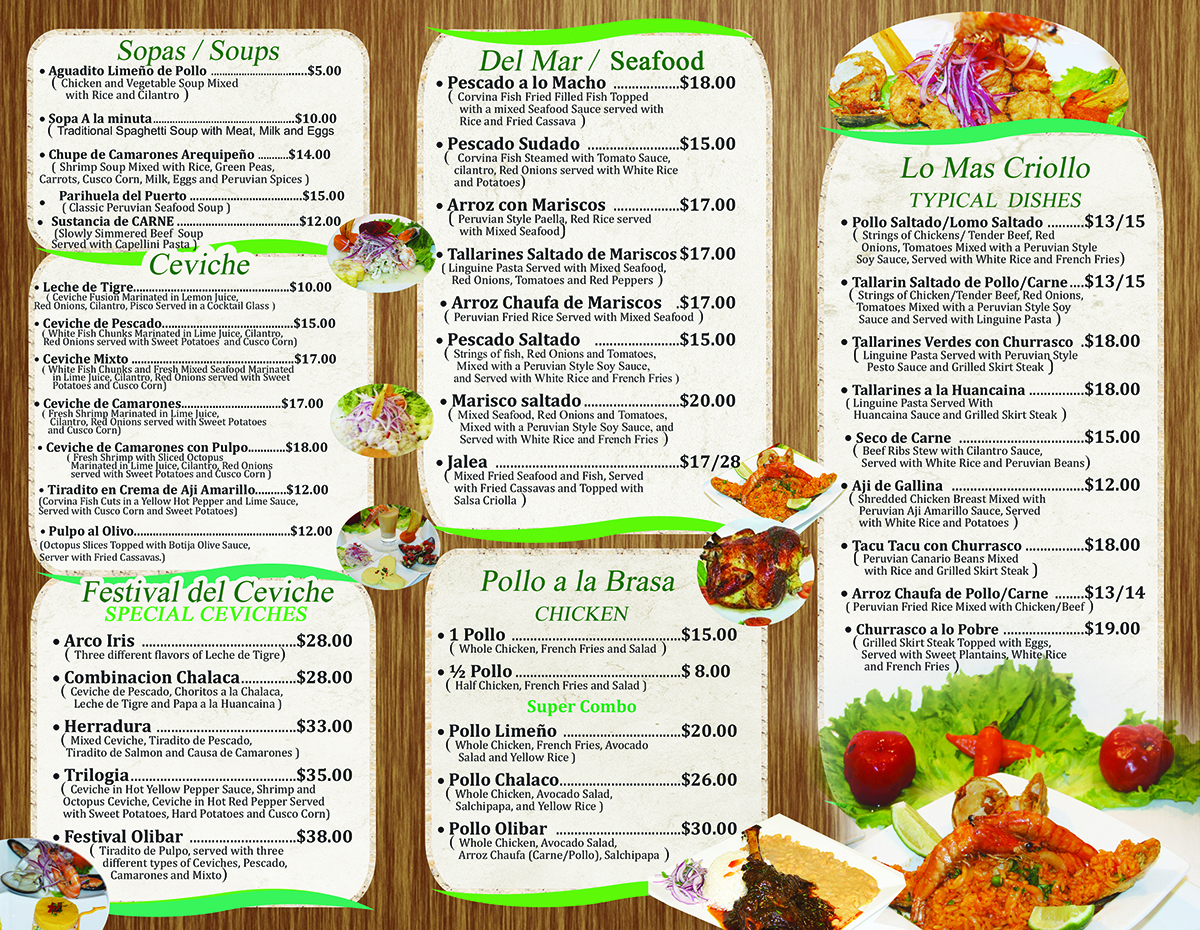 We need a new tri-fold 8.5"x11" take out menu for a Peruvian restaurant based in New Rochelle, NY. We have a vast selections of dishes from appetizers, seafood based dishes, desserts, Peruvian ceviches and more. We have attached the following: