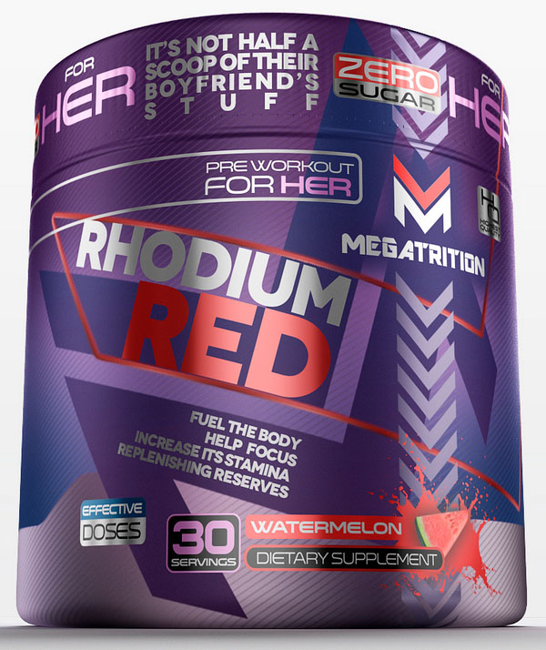 The name of the product is RHODIUM RED and it is a gym preworkout supplement for women.