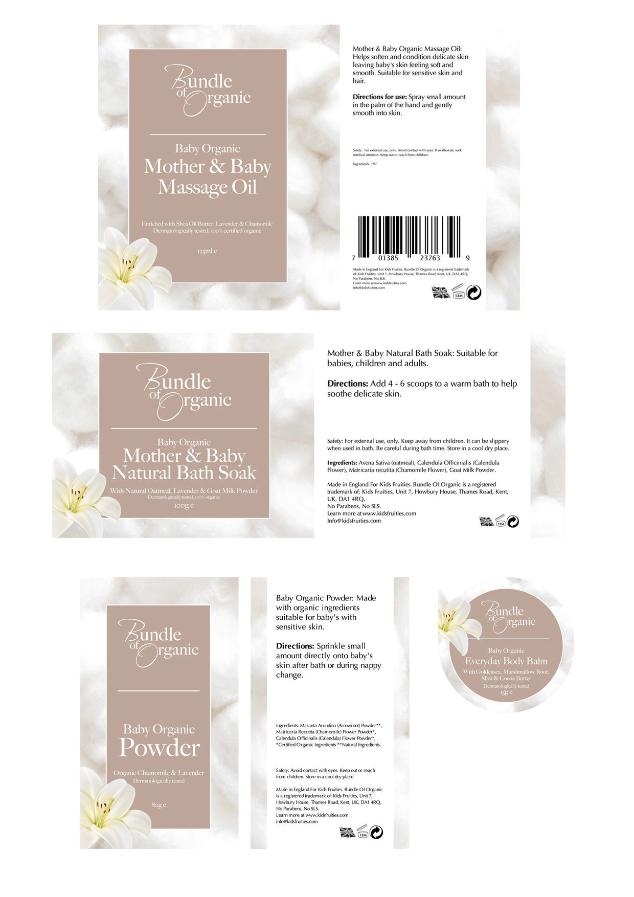 Bundle Of Organic is developing a line of Organic and Natural skin care products for babies and toddlers, although our skin care can also be used by adults too. These products include a body lotion, shampoo & body wash, powder, hair cream, massage body oil, bath soak, baby balm, Bar Soap, gift box and many more.