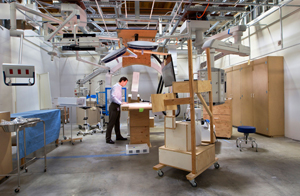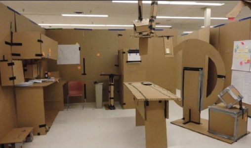The cardboards are used as mock-ups for key facilities, which aids in the design of registration counters, wall partitions, blood-taking stations, etc. Through the scenarios, teams were able to walk through and take notes on planned distance and distribution of space. It looks almost like a "cardboard city".