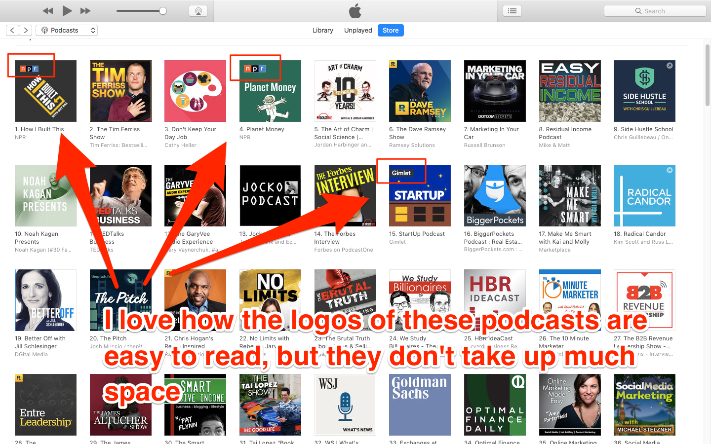 I love how the logos of these podcasts are easy to read but they don't take much space: