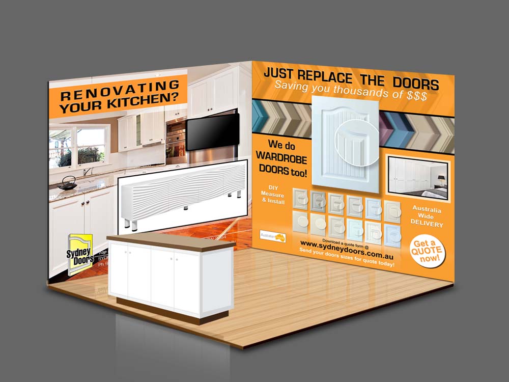 - The background colour of the stand artwork should remain the same bright colour of our logo. The fonts should be similar to that used on our website www.sydneydoors.com.au