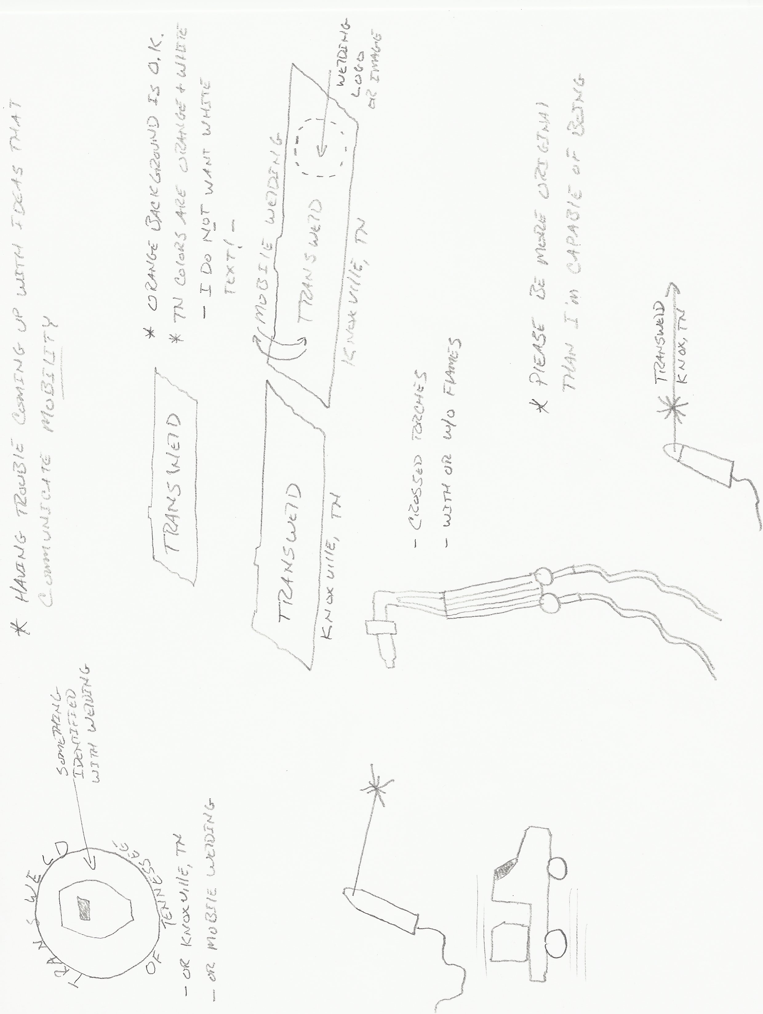- City & state information: Knoxville, TN. Idea #1: Transweld superimposed on the state as a background. Ides #2: Perhaps a circular design with a welding hood (crossed torches, etc.) surrounded by the text to include "Transweld" around the top & either city/state info, "of Tennessee", or "Mobile Welding Services" around the bottom.