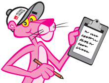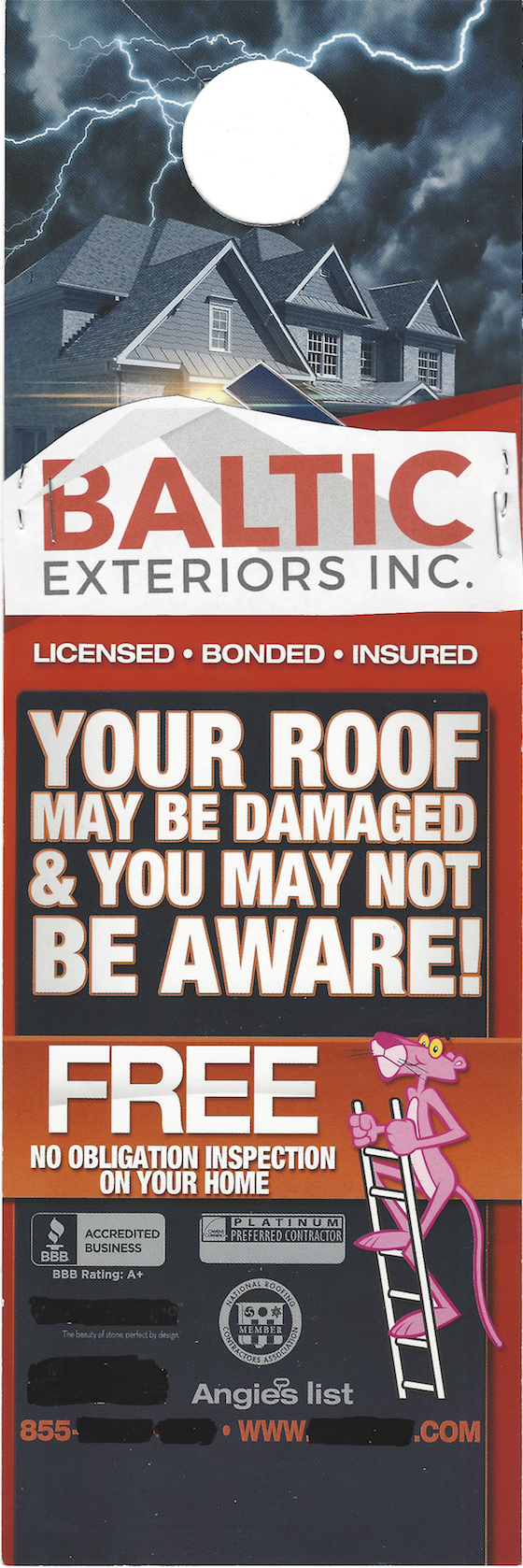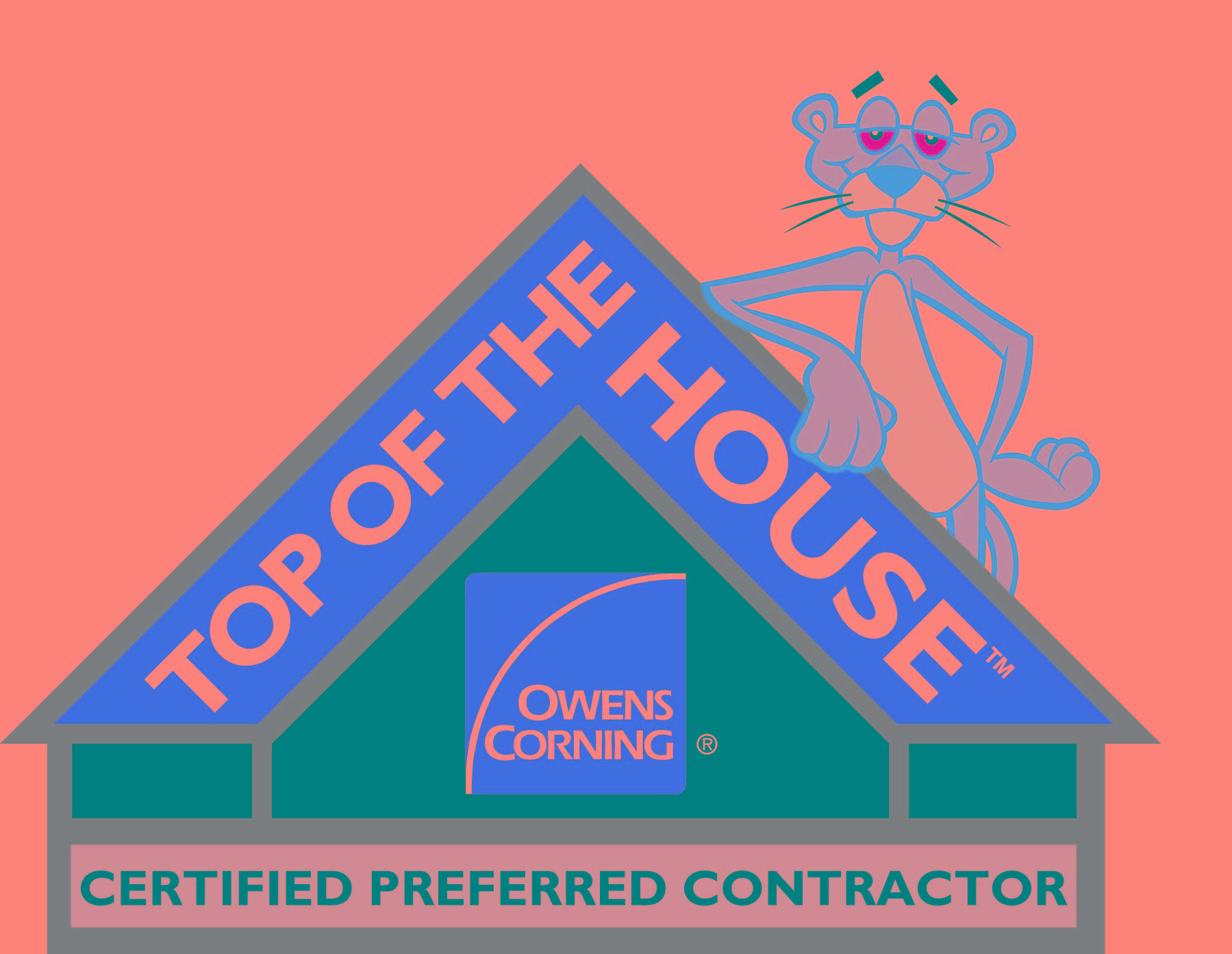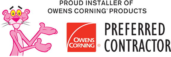 - Pink panther, Owens Corning Preferred Contractor Logo, BBB Logo, Angie's List logo, Home Advisor logo,