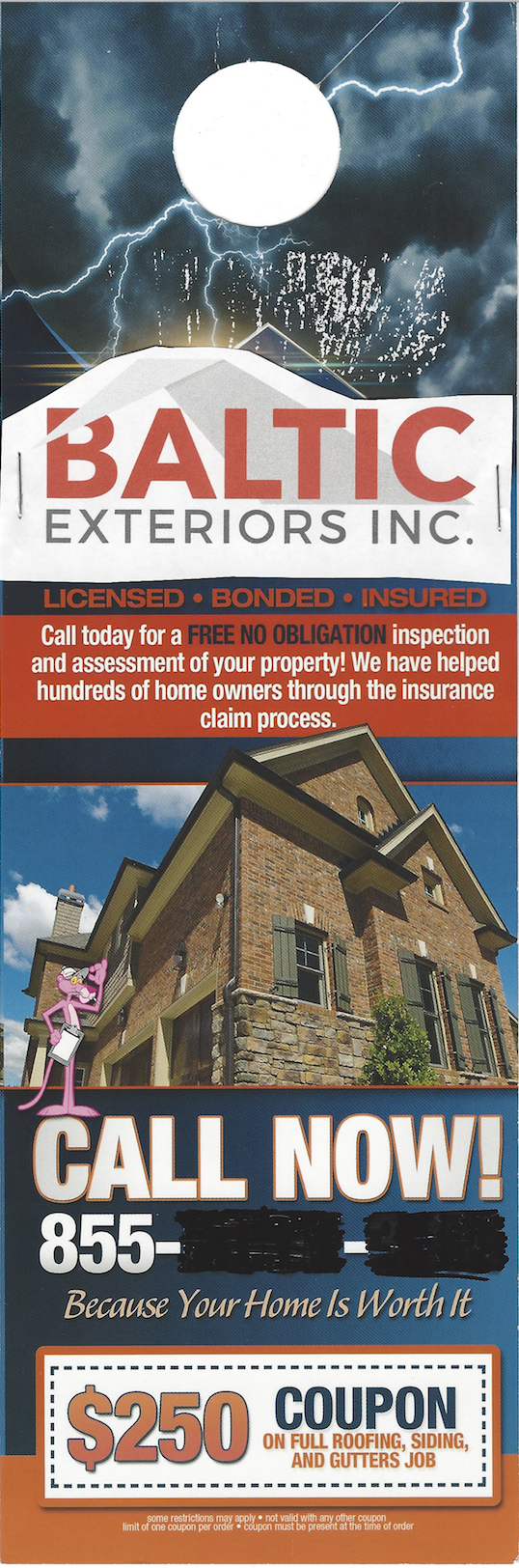 We need to design a door hanger mirroring our competitors door hanger (see attached). By mirroring we mean same content, message and information (except Company information), but a new design, having in mind storm industry. We inspecting roofs for a hail, wind and storm damage and determine if Insurance companies needs to be involved. Please see our company logo attached. Company phone number should be 630-243-5394. Web address: www.BALTICexteriors.com. Front and back of the door hanger should be different. Promotional coupon dollar amount should be the same. Size: 4" wide x 12" hight.