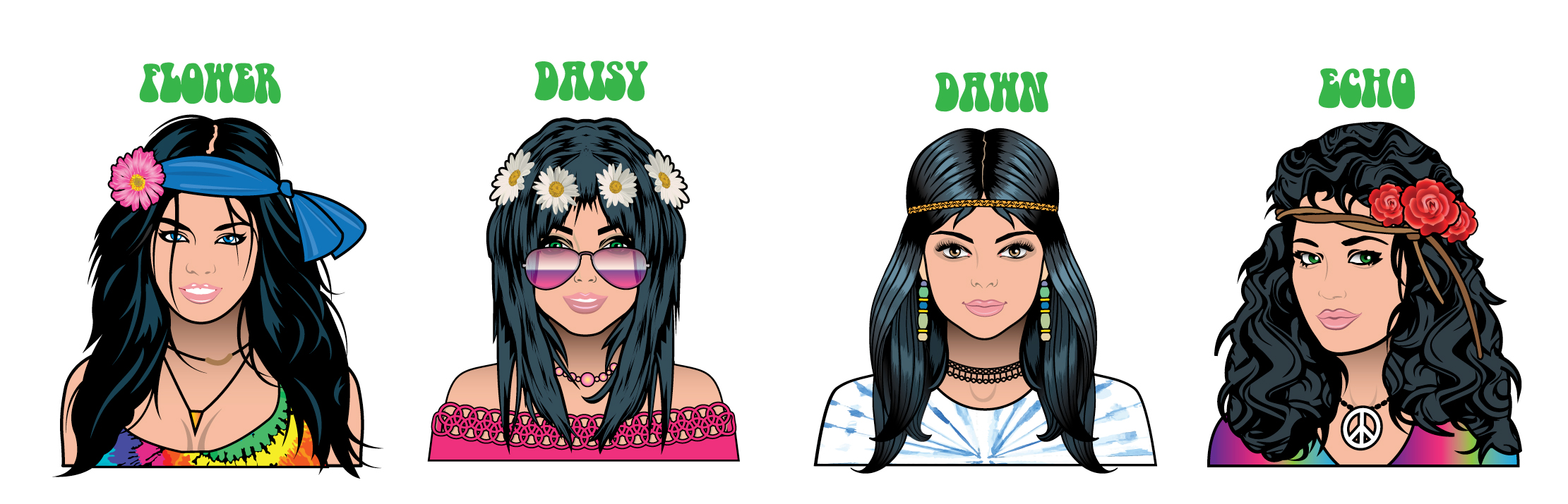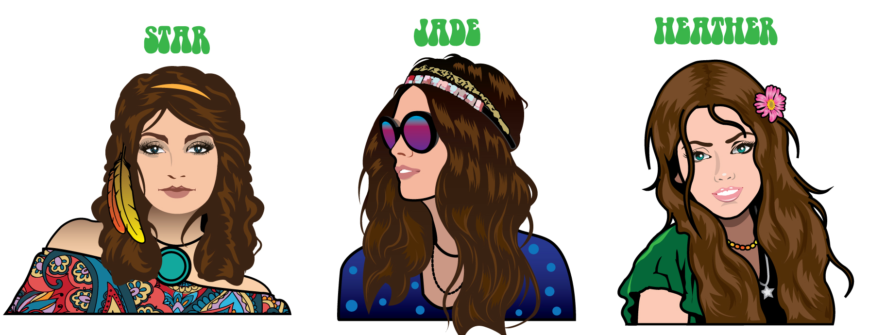 we need 10-15 cartoon looking designs of hippie girls from the shoulders up... to be used for our packaging designs we have had some done but they are not quite the right style... see examples.. we started with a real girl and had someone make it cartooned but it is not quite right here is an example of more of the style i need her converted to... her name is aries and i would like hippie accessories (ear rings, head band, necklaces, clothes etc. . lets start with one and then we can do the rest