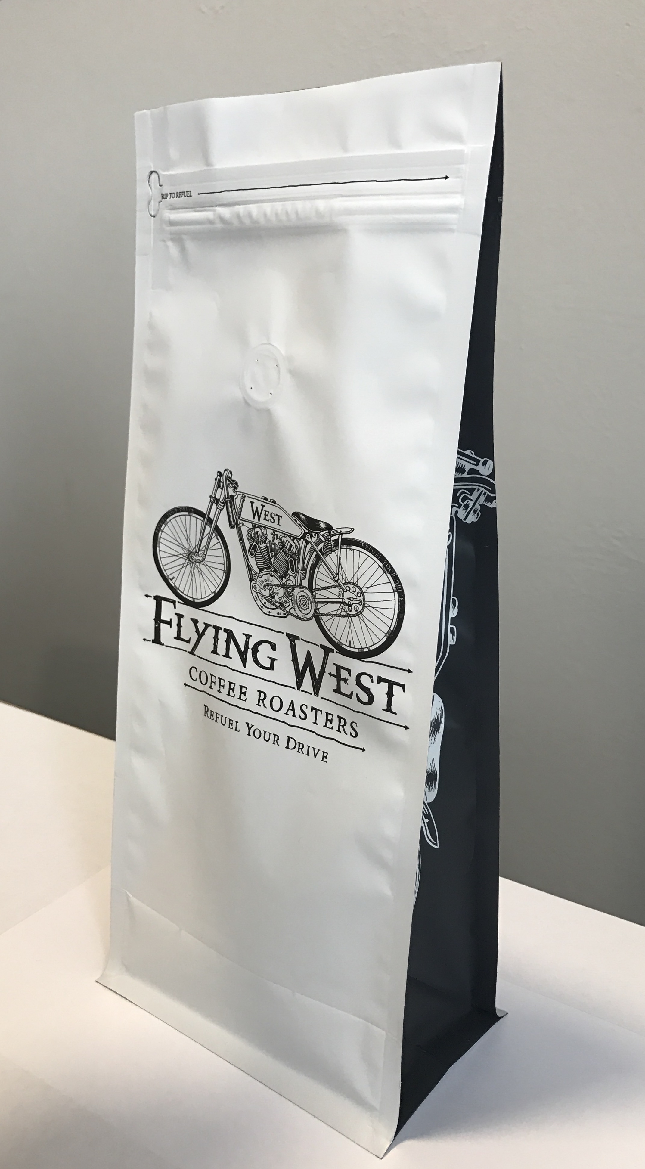 We are now changing our bags from side gusset bags with valve closed by tin ties to flat bottom bags with zipper and valve.