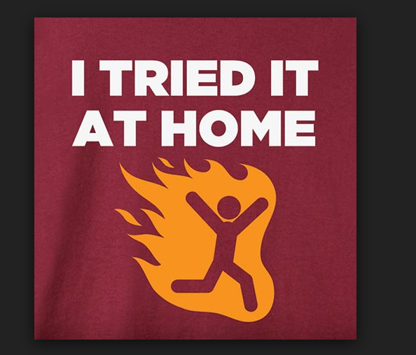 I would like a block figure lit on fire with the words I TRIED THIS AT HOME beneath. The screenshot is the idea but I cannot copy the exact thing. Colors and fonts are up to artistic discretion. Would like it to resemble the figure found on a "wet floor" sign. Running figure with fire behind him or engulfing him? The lettering should not be too small.