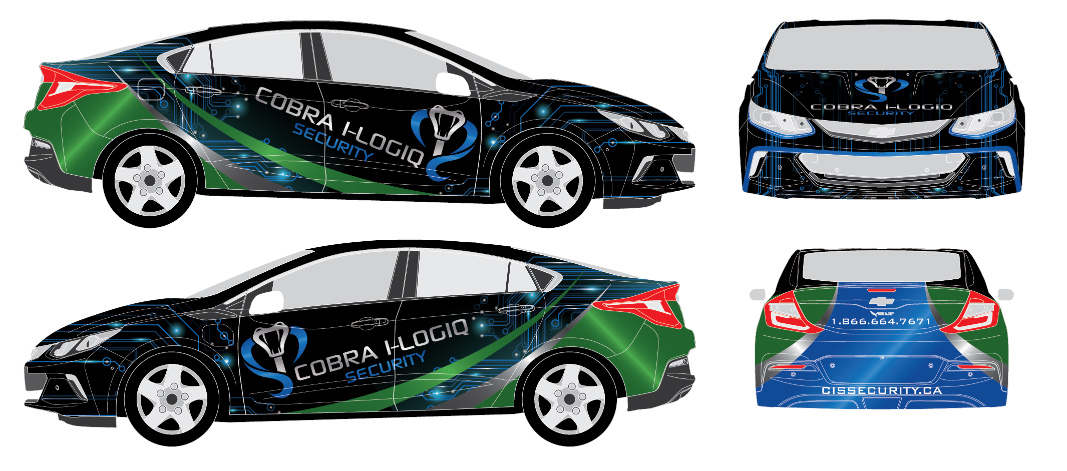 We need to wrap our new "BLACK" cars "2017 Chevy Volt" with our WEBB SOLUTIONS logo, need to design it to make it eye catching, professional and not too much. We want some green on the car bumper to show it's a "green" electric car.