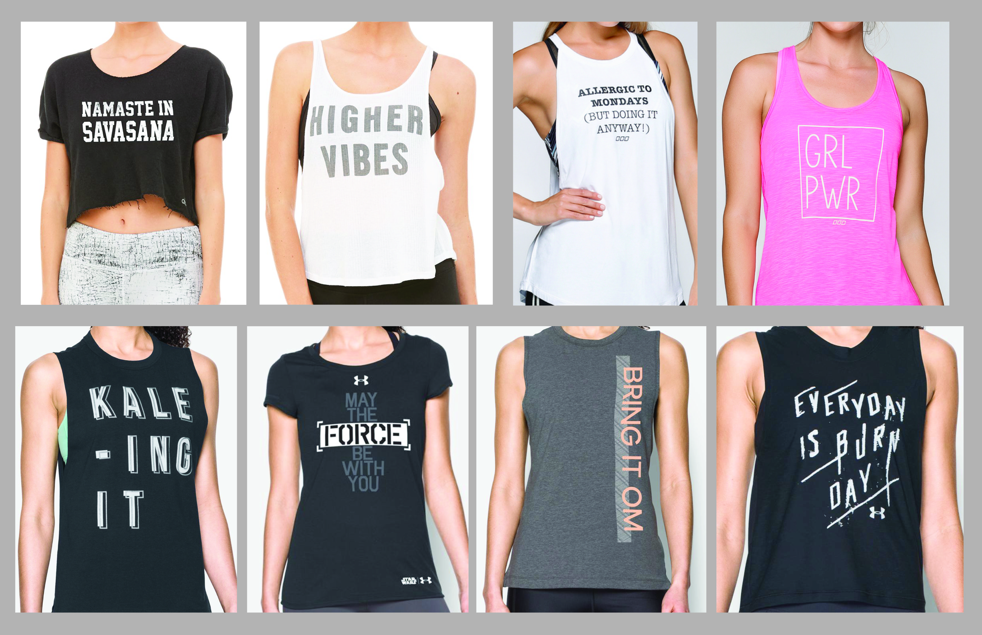 We need to develop a small collection of five women's activewear tanks with motivational graphics. These graphics are simple designs with nice typography and clever sayings. See the inspiration page attached - we do not want to copy the ispiration, but want to capture a similar look & feel. Sayings should be clever and trendy, motivational or funny. Would like 5 graphics total that work together as a group. One graphic should be about yoga, one about running, one humorous, and 2 your choice. The designs can be very simple (like the inspiration) but can involve a few graphic elements to make them interesting. Foil, metallic ink, and reflective heat transfers can be used in the designs. The final group of designs will be used for tank tops and should look clean and modern, something you would see at a sporting goods store or the activewear section in a department store.