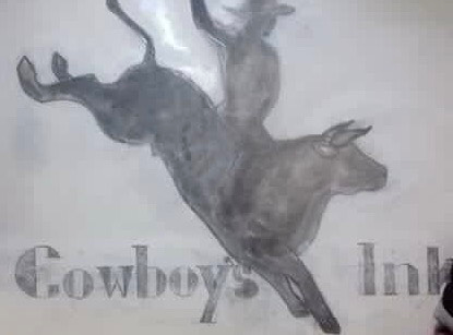 - A bull silhouette, or a silhouette of a man riding a bull with the signature of cowboys Ink written with a quill pen., I would like to see