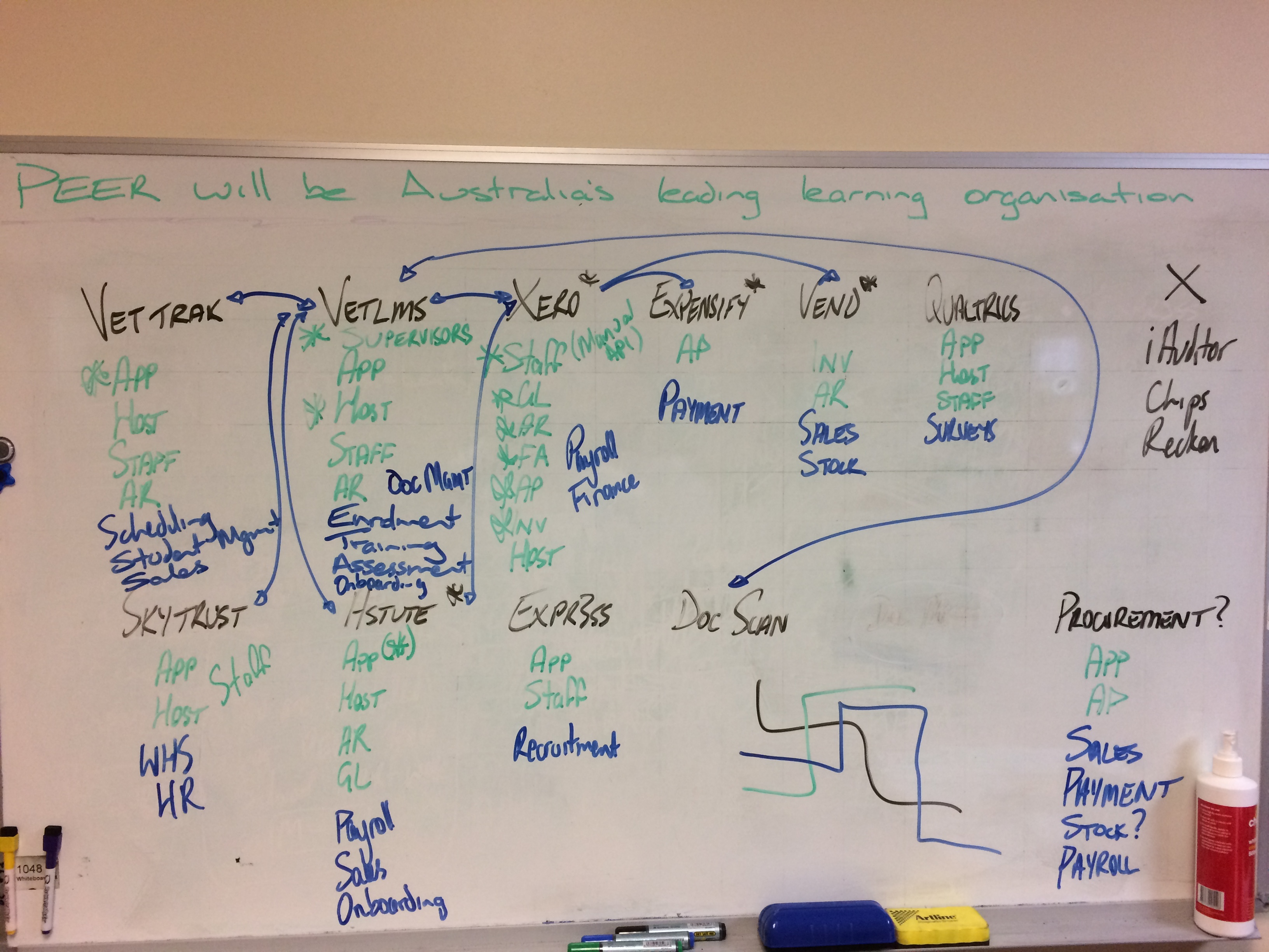 I need two infographics that display the interaction between the many software systems used in our business. I have attached photo of a drawing we did on a whiteboard. Obviously, our drawing was done in a basic layout but we are looking for a creative way to display this.