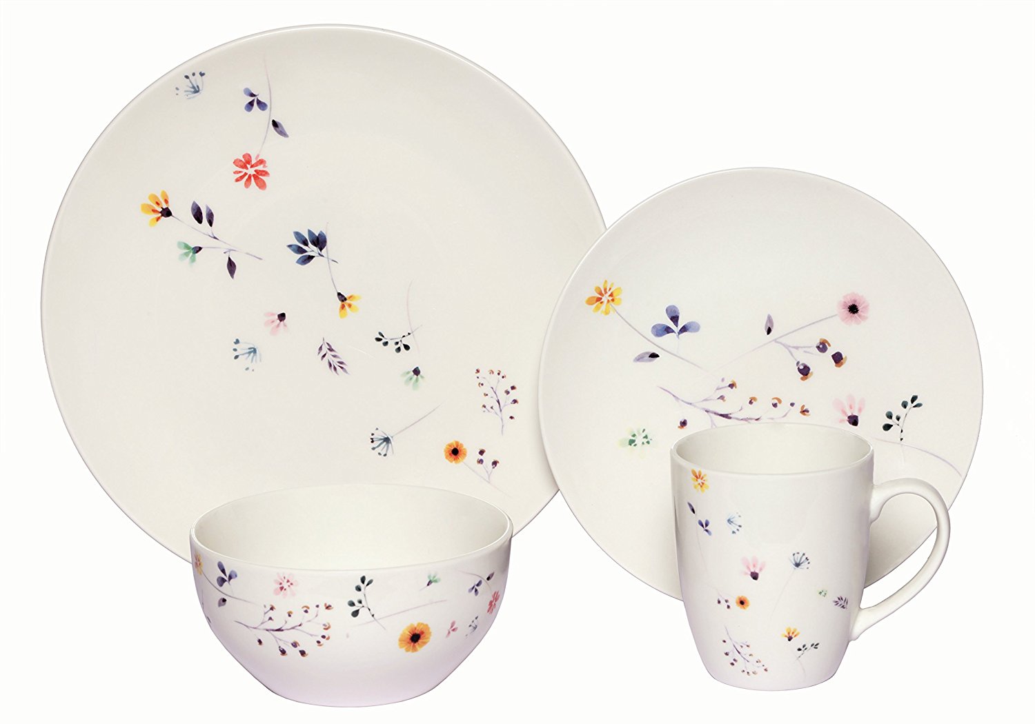 Design an illustration for a 4-piece dinnerware set that will include a dinner plate, salad plate, bowl, and mug. Each of the four place settings will have its own design but stay within the same theme.