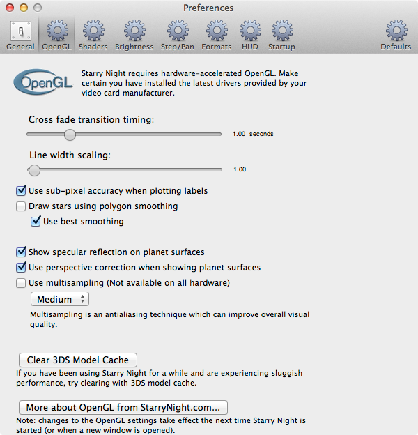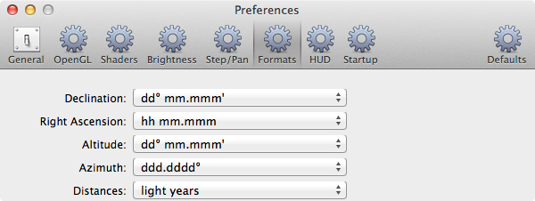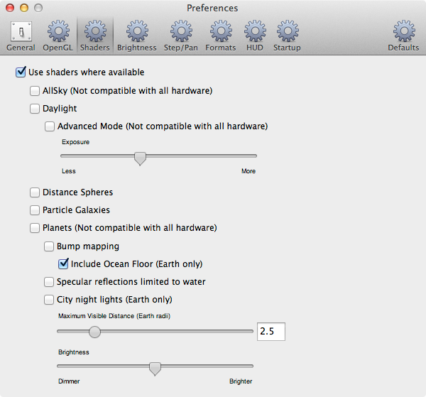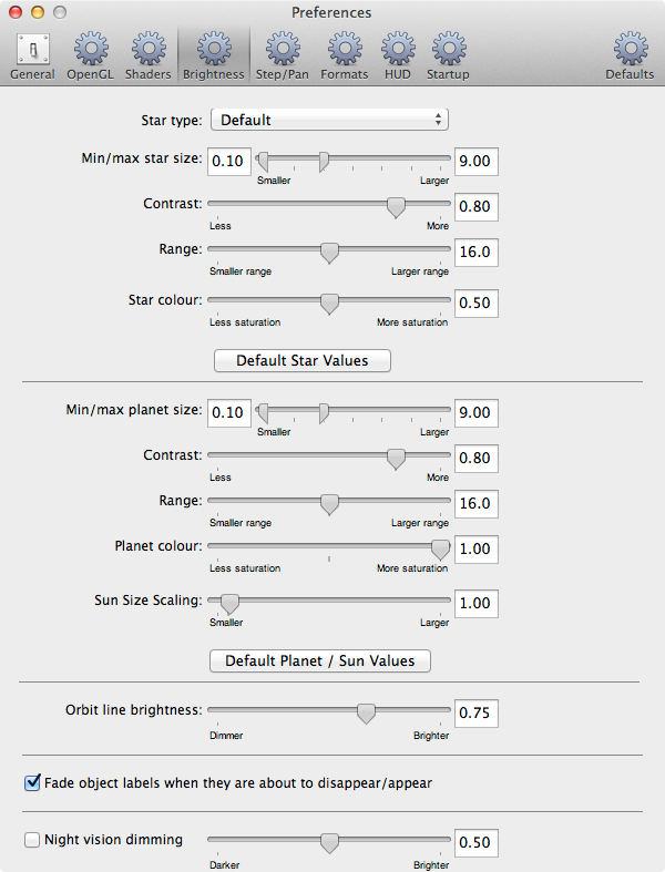 3) Brightness/Contrast Preferences. These allow setting contrast/color/size of displayed objects (we might rename the tab) like stars and planets, lines etc.