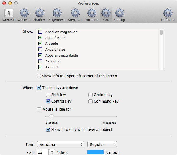 6) "HUD" preferences allows the user to select what to show when mousing-over objects in the sky.