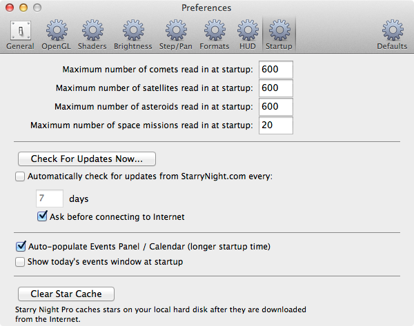 7) "Startup" preferences allows the user to set options for things like how many objects to load, whether to check for updates, whether to show new events in the sky.