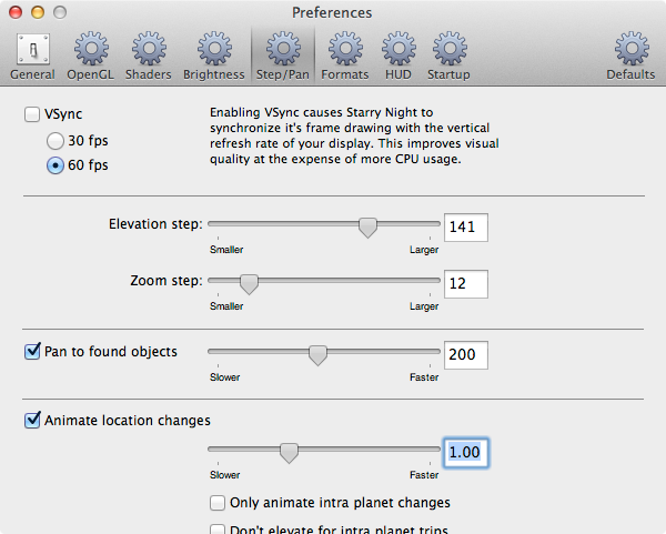 4) Step/Pan. Allows adjustment of view panning speed, location change speed (think Google Earth trips) etc.
