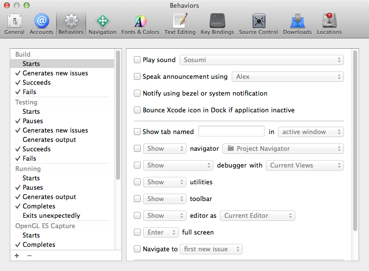 I have included screenshots for each tab (under construction) relating to each of 7 icon buttons. The 8th button is "Factory Defaults". I have also included a screenshot if the xCode preferences toolbar for reference.