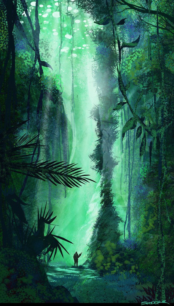 - See the example picture with the man moving into the jungle for an example composition. This picture is good but looks too alien and perhaps too lightly colored. It would be great if the jungle could look more brooding.