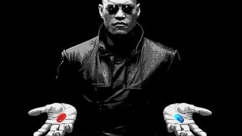 Briefing: Morpheus with his two hands with the red and blue pill, see image in attachment