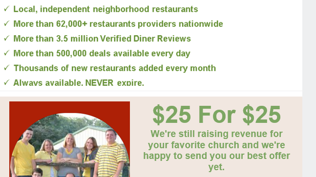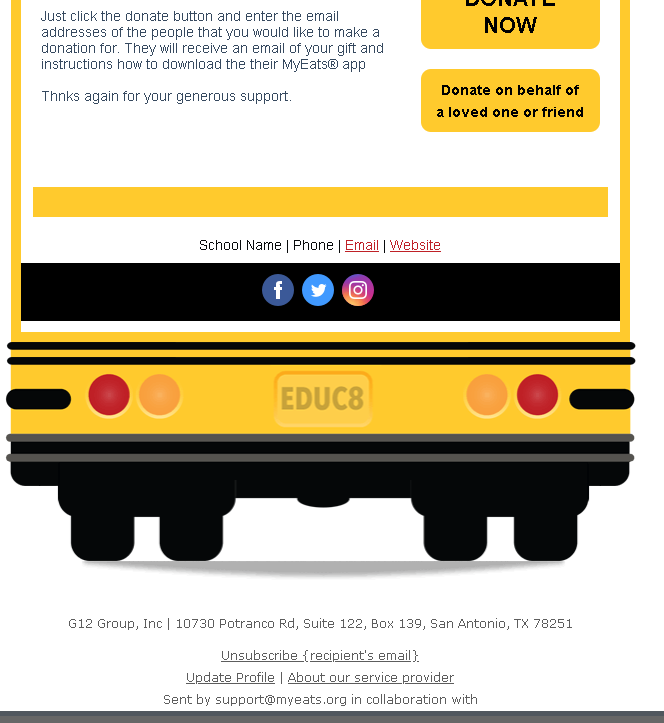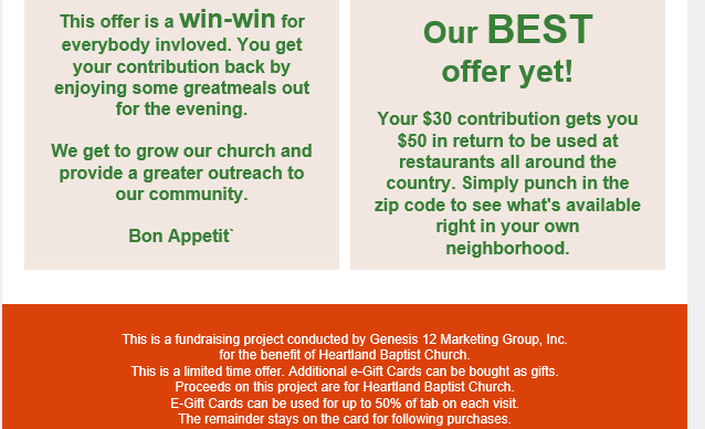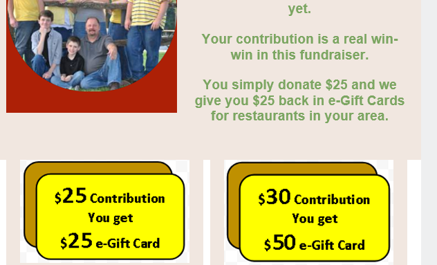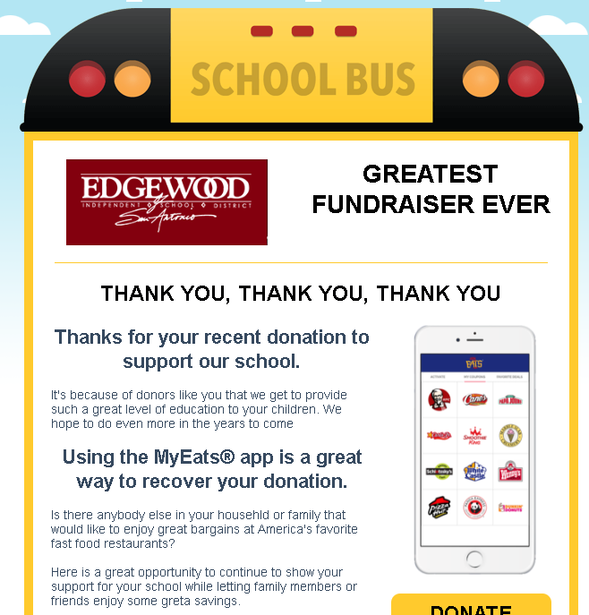 I included a school bus project that we used in a previous campaign. This campaign, however, is a $25 for $25 promotion. Consumers make a $25 contribution for the school or charity and receive back a $25 e-gift card to be used at area restaurants.