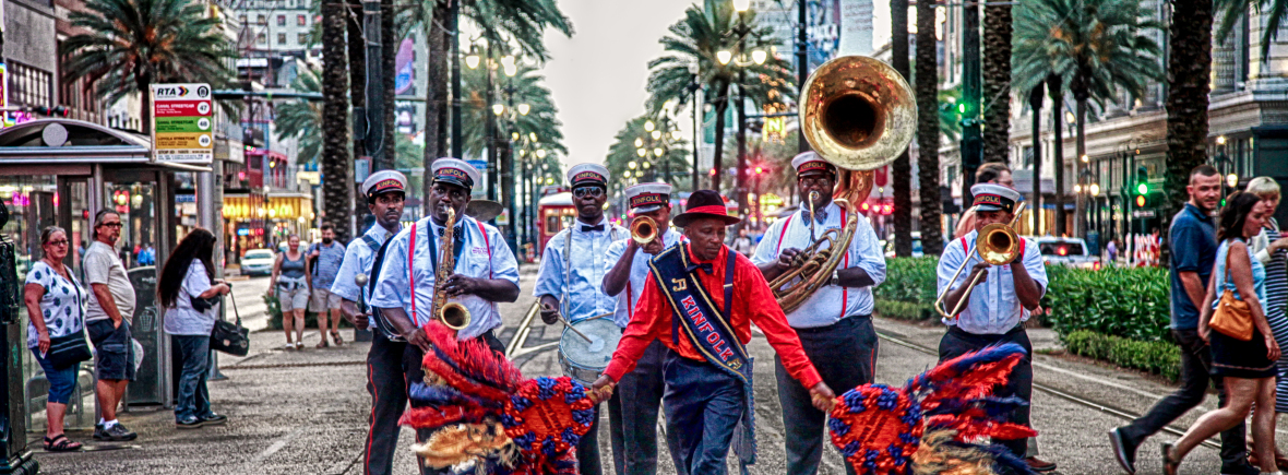 - - Please include imagery of a New-Orleans-style parade (with traditional brass band) *OR* imagery of horn musicians (trumpeter, trombonist, etc.). It does not need to be a photo...could be an illustration...attached some for inspiration