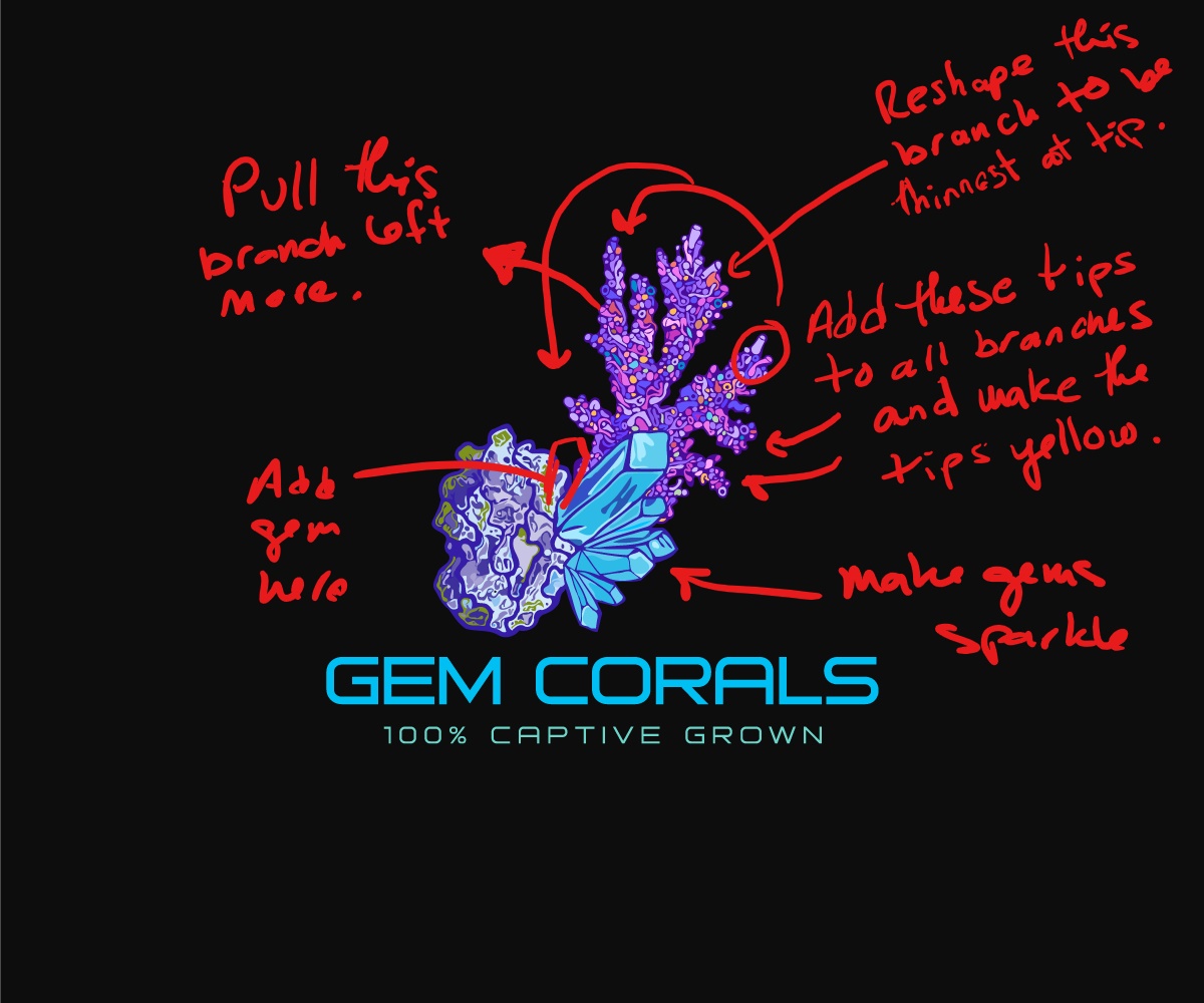 - The logo should combine 3 elements - 1) colorful live rock as a base where the gems and coral are growing from (this is a minor element however and should not be too large) 2) Neon blue gems growing out of the rock and 3) the main part of the logo should be a beautiful multicolored branching acropora coral (the acropora is the most important part of the logo as this is what I will be selling). One of the attached files is an example sketch of what i'm generally looking for (but please expand upon the concept).