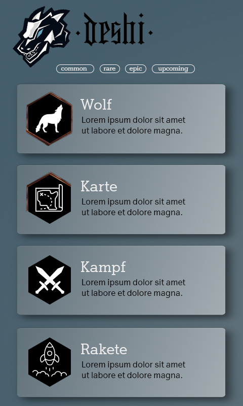 We're looking for a redesign of an esport related community app. It should look very sharp and modern like trending fitness apps. Logo and general CI is done and fixed. UI needs to be reworked. In detail: - Overall GUI and Look and Feel - Playercard, Friends List, Achievement List - Icons for Achievements - Status system (Actually done via special borders) - Deshi Logo and dragon head are fixed, it can not be changed Actual Designs attached and so styles and look and feel we like. What we dont like very much at our actual design: - Look and feel of the borders. They need to look better and more modern. It is a break of the style - The look needs to be fresh, like fitness with asiatic touch - Good achievement icons are needed. Personal tryout link of the actual version: (It will mainly be used on mobile.) Https: //a1esports.flave. world / smart wear / members / 56bf8bba-9e7f-4c08-807e-1aab6c483dd6