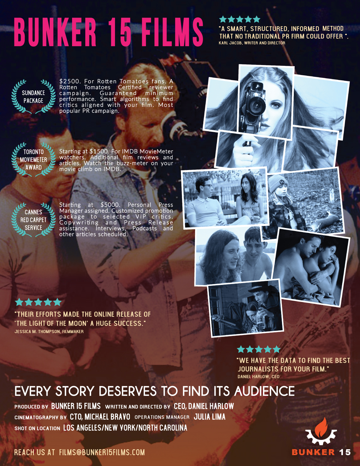 Bunker 15 Films is a film publicity company that gets movie reviews for small films / filmmakers. We take low-budget Indie films (often Festival darlings) that would otherwise be ignored by the Press and motivate journalists to watch and write about the films. Many of these films will be straight-to-VOD (Video on demand) and most will not have a theatrical release. Although some will have limited theatrical releases.